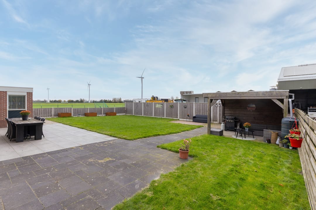 De op het zuiden gerichte achtertuin is ingericht met een groot terras met ruimte voor een grote tafel, loungeset en eventueel een buitenkeuken. De overkapping biedt ruimte voor een gezellige tuinset en de vrijstaande houten berging is ideaal voor het stallen van de fietsen en tuingereedschappen.