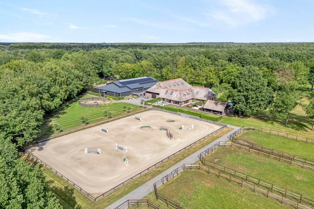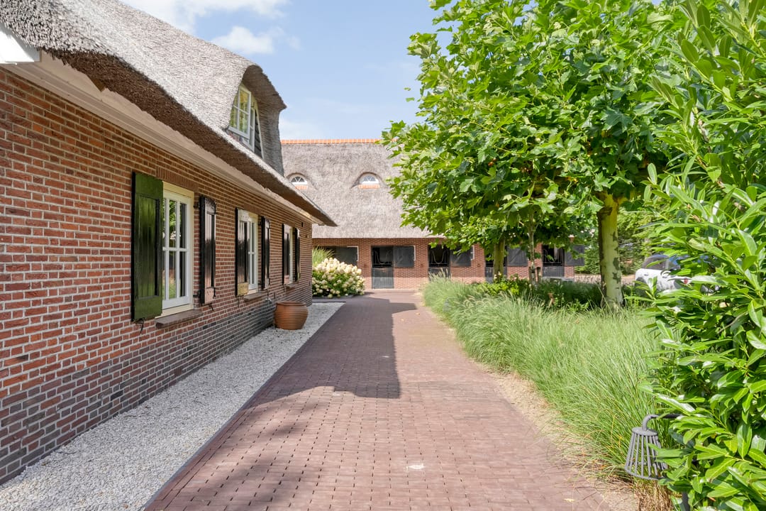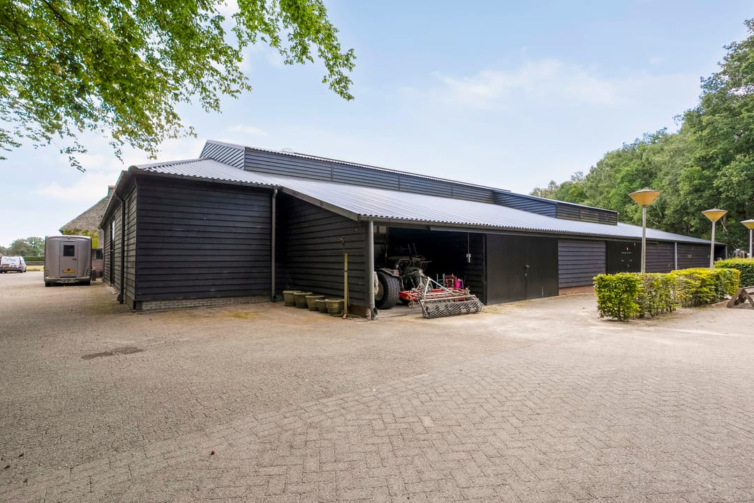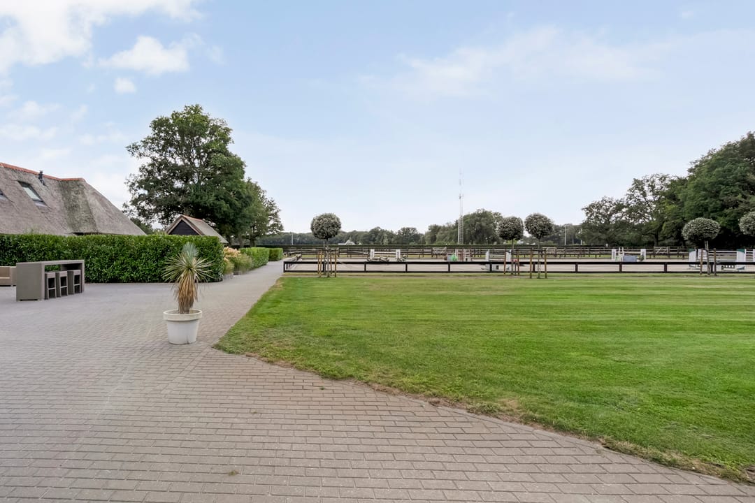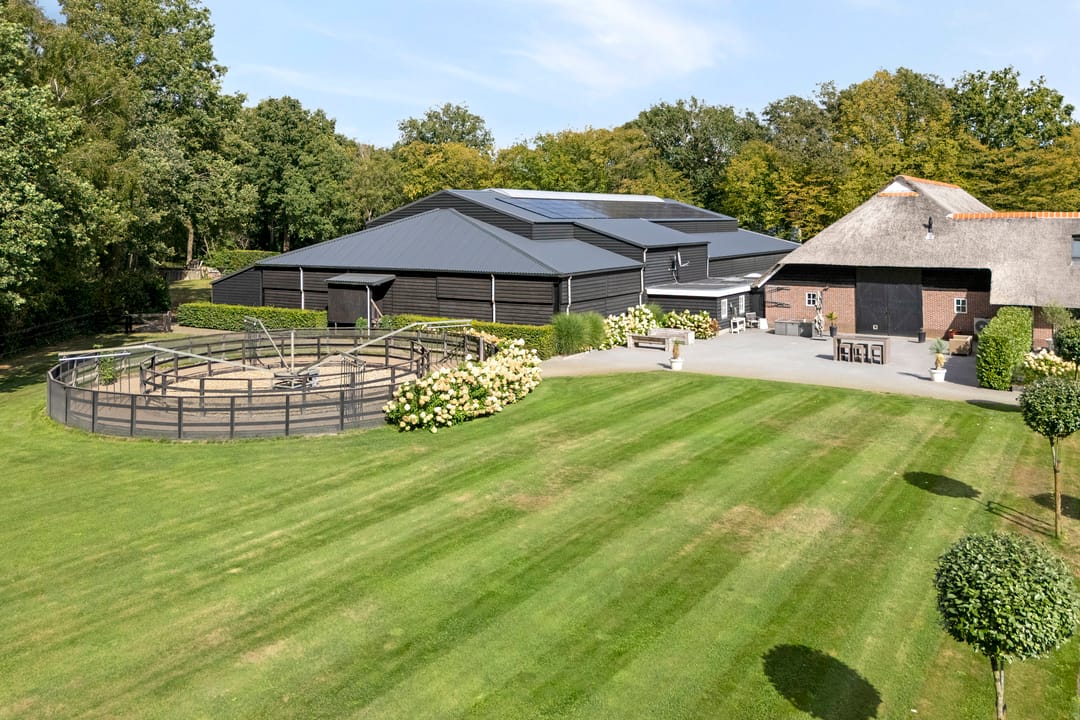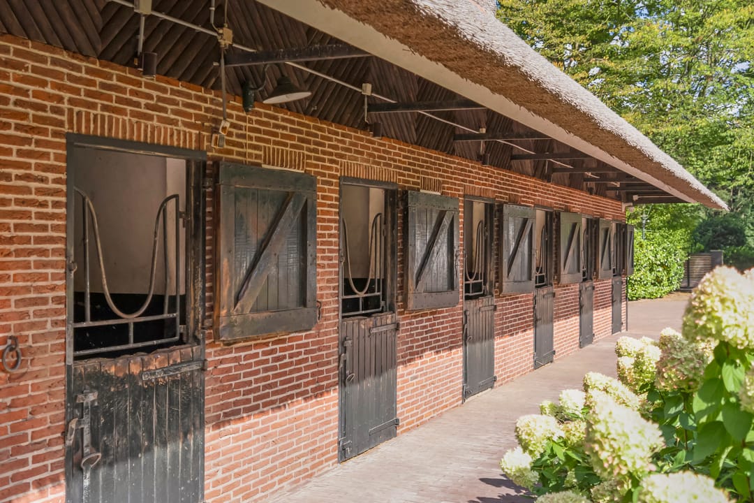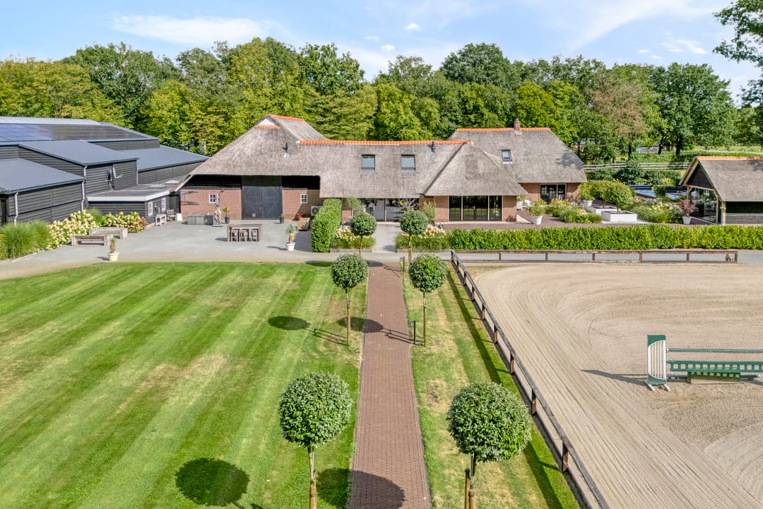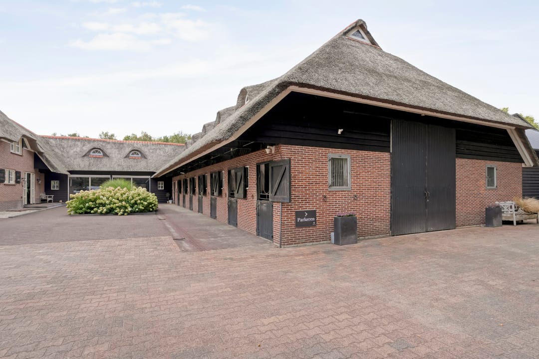 Het geheel bestaat uit een sfeervol en riet gedekt Landhuis met eveneens riet gedekt stalgebouw waarin 11 mooie boxen, waarvan 8 met buitenluik. Verder een zadelkamer en een fraaie rijhal waarvan de rijbaan afm. 20 x 40 m met een goede bodem en een gezellige foyer, keuken en toilet groep. Tevens is er een stapmolen aanwezig, paddocks en een grote buiten rijbaan met eb- en vloed bodem.