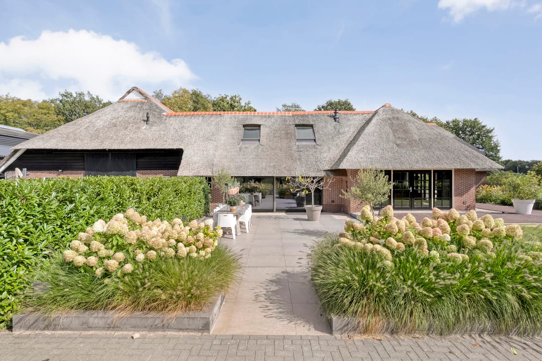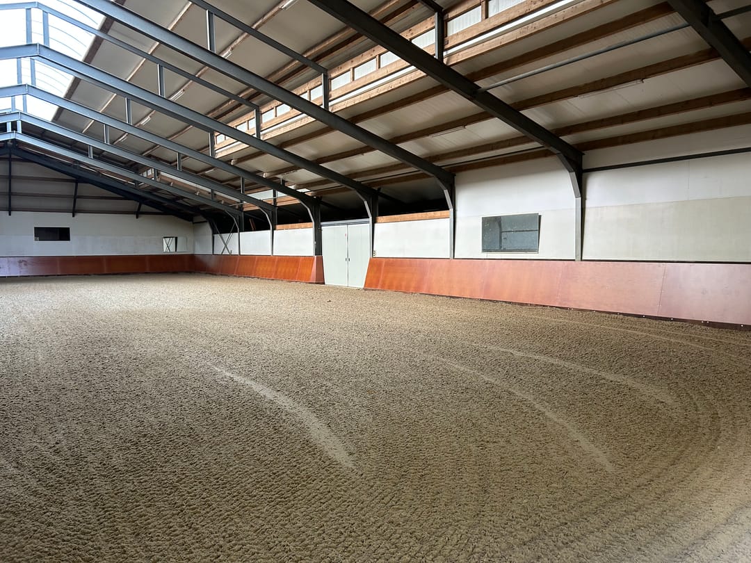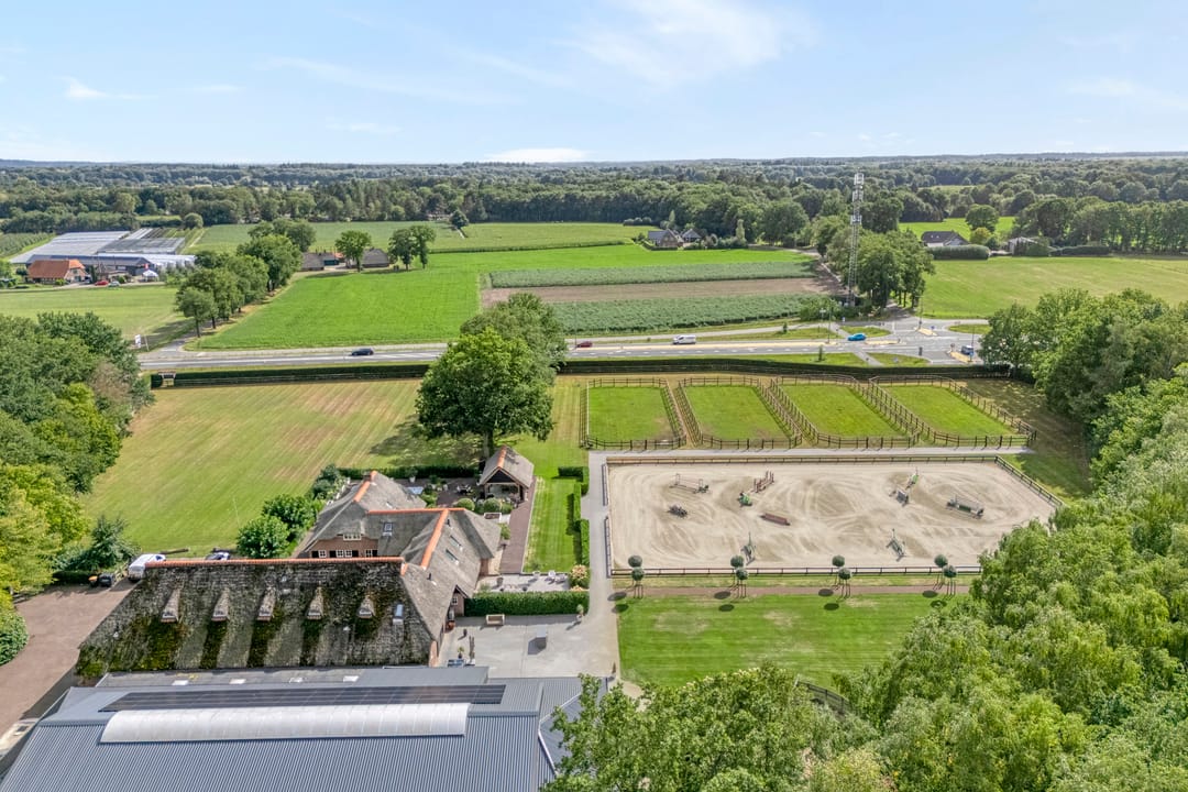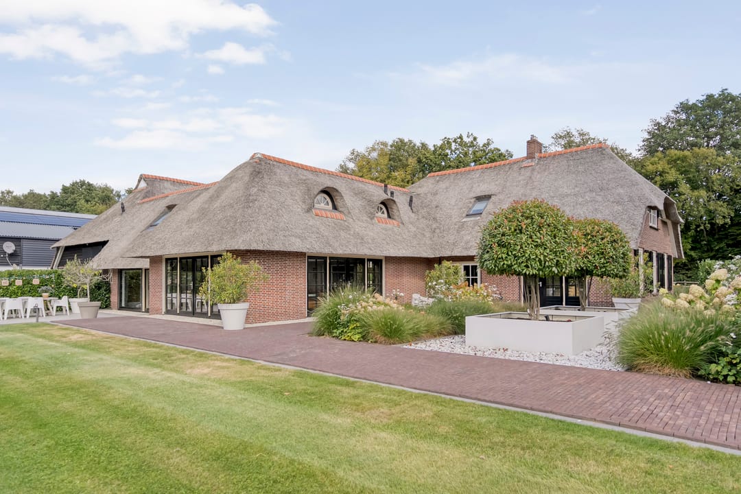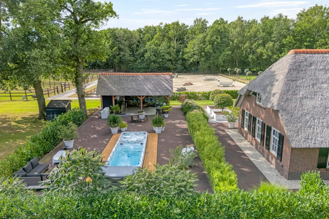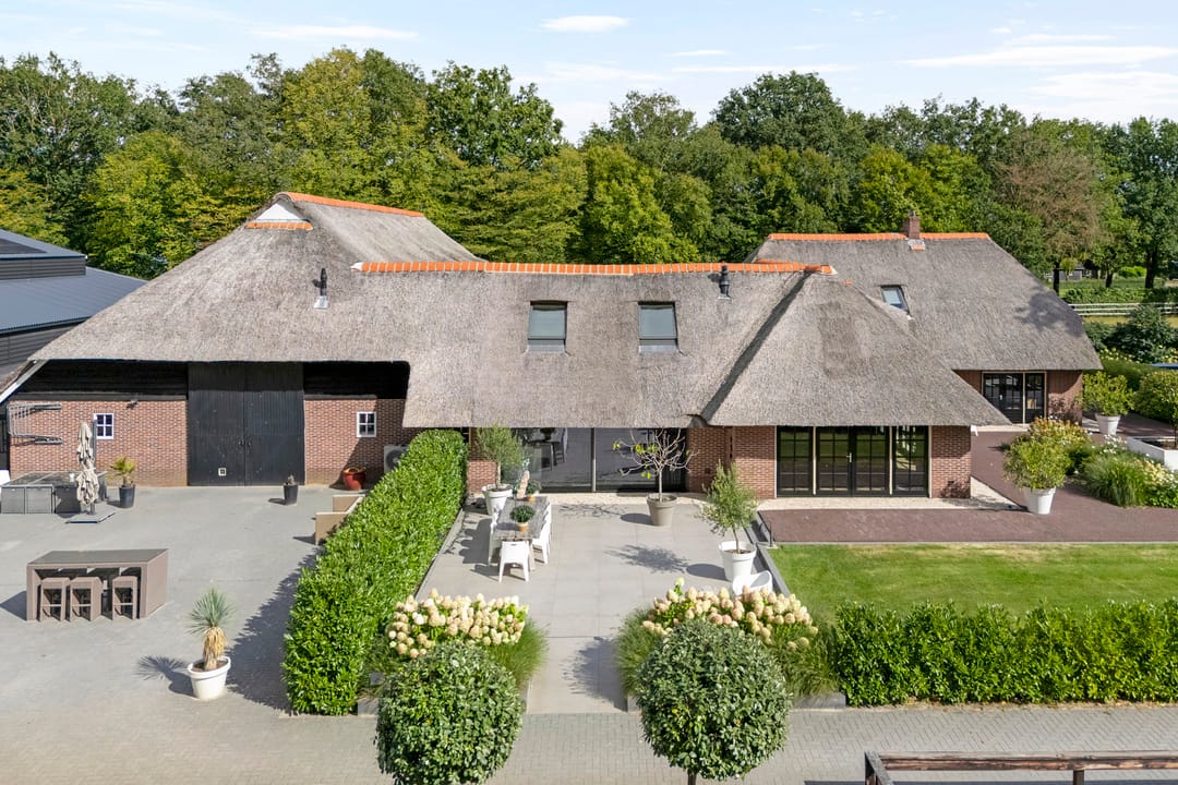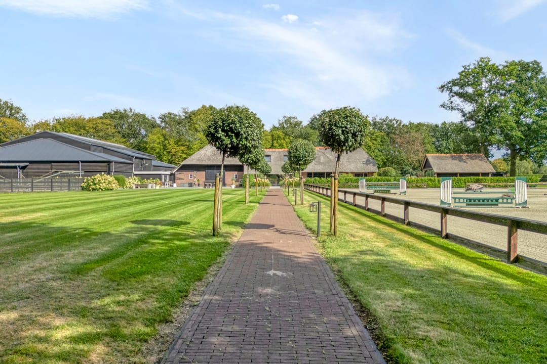 Het geheel bestaat uit een sfeervol en riet gedekt Landhuis met eveneens riet gedekt stalgebouw waarin 11 mooie boxen, waarvan 8 met buitenluik. Verder een zadelkamer en een fraaie rijhal waarvan de rijbaan afm. 20 x 40 m met een goede bodem en een gezellige foyer, keuken en toilet groep. Tevens is er een stapmolen aanwezig, paddocks en een grote buiten rijbaan met eb- en vloed bodem.