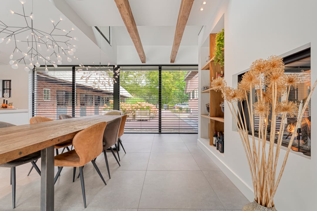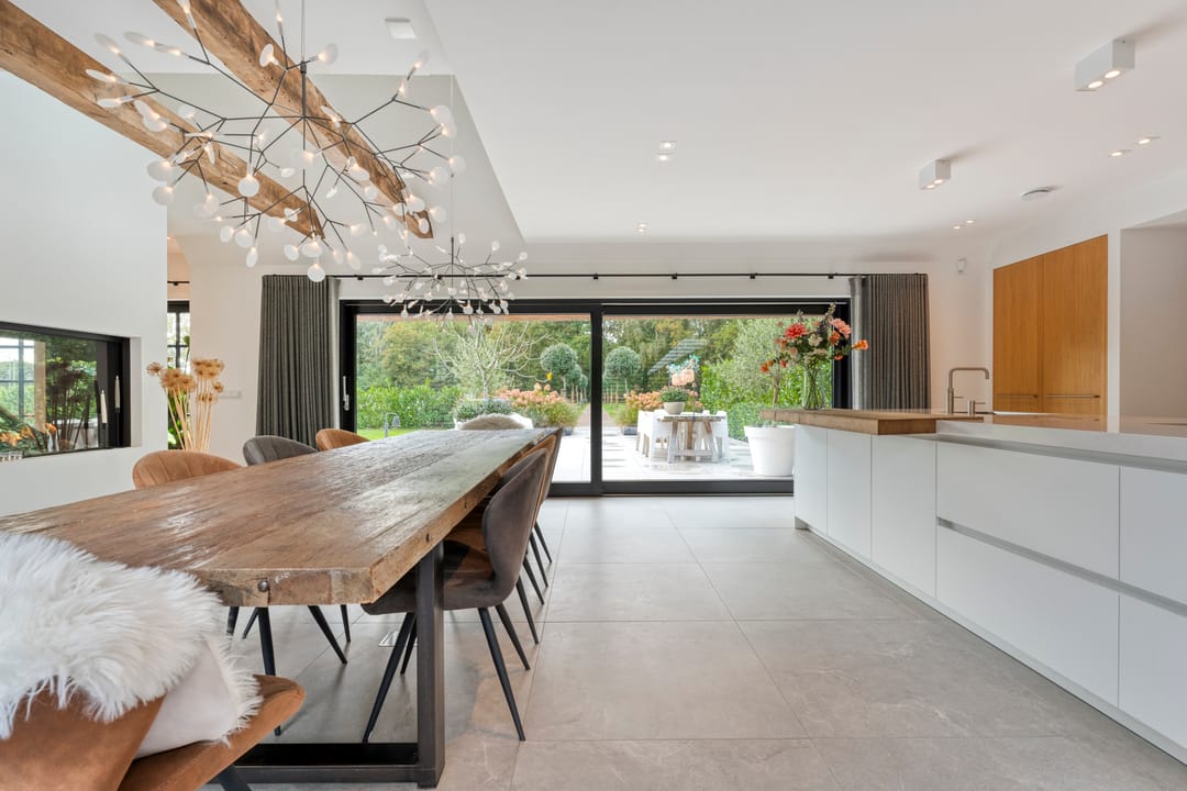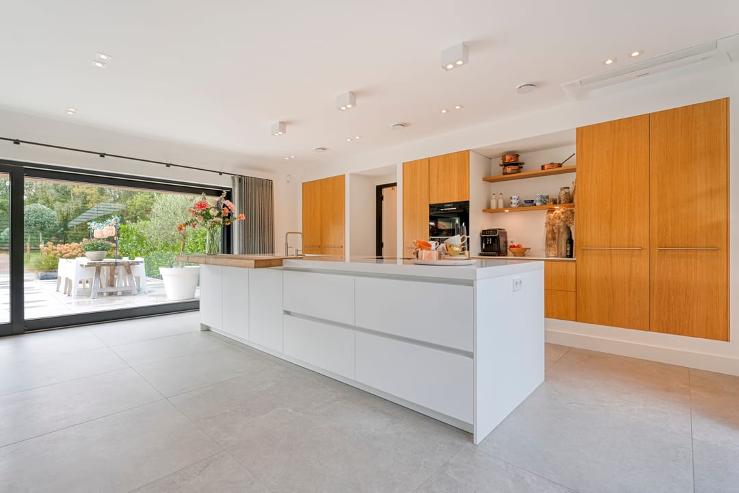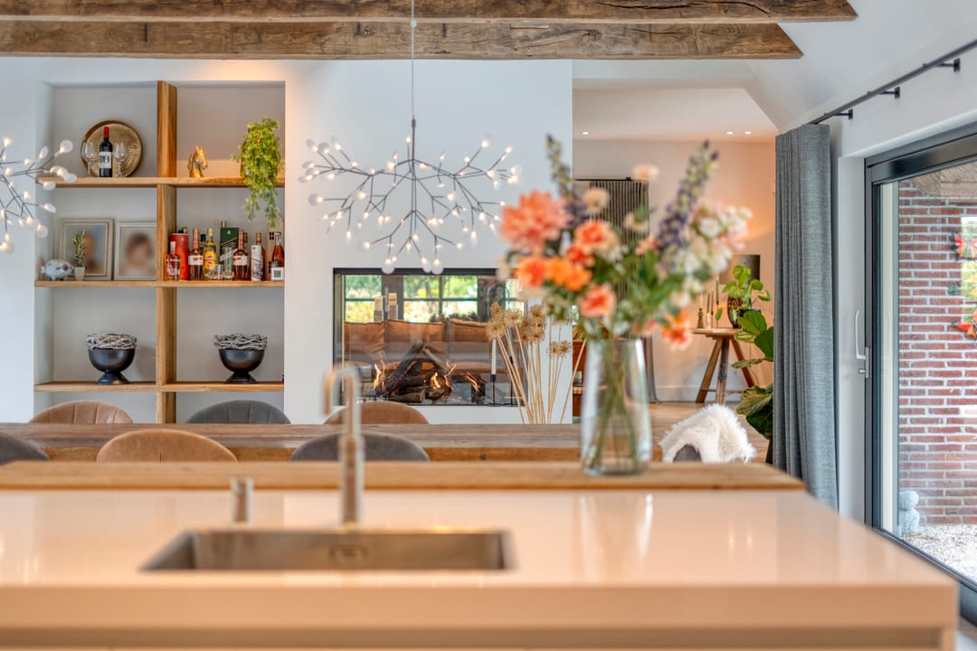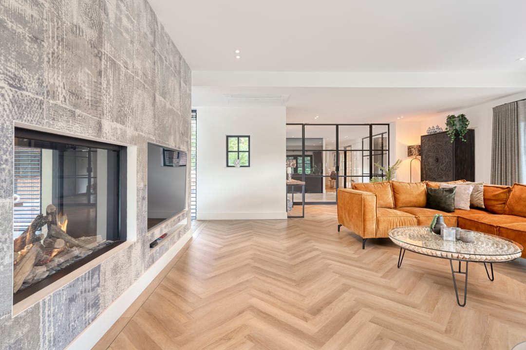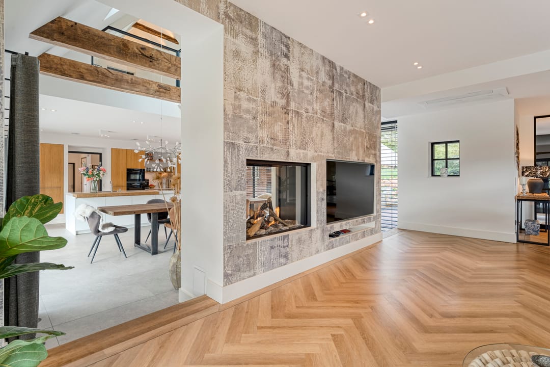 Grote woonkamer met doorkijkhaard (gas) verbonden met luxe uitgevoerde keuken met alle inbouwapparatuur. Via de keuken komt u in de bijkeuken met ingebouwde vriezer en koelkast en een natte ruimte voor wasmachine en droger.