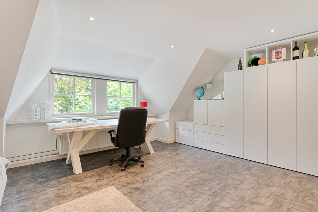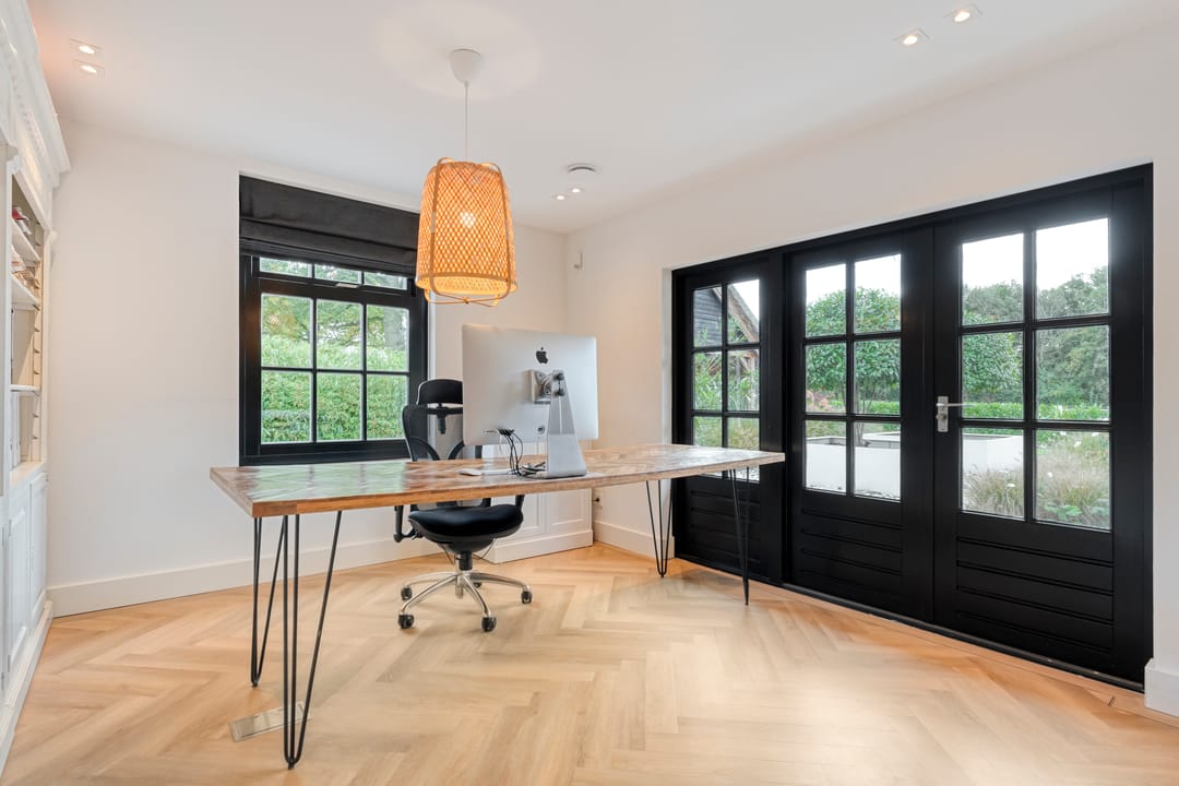 Groot kantoor met inbouwkasten en deur naar de tuin.