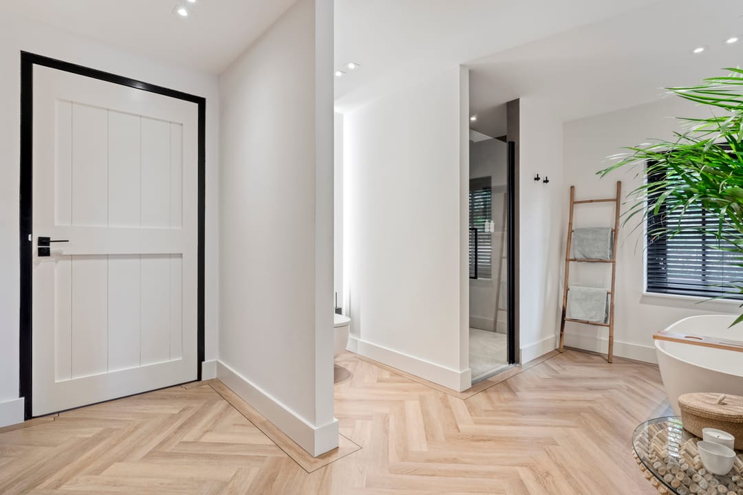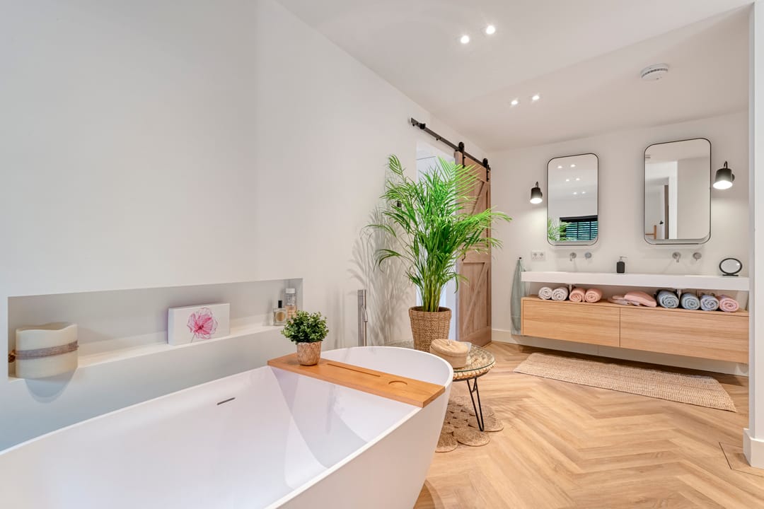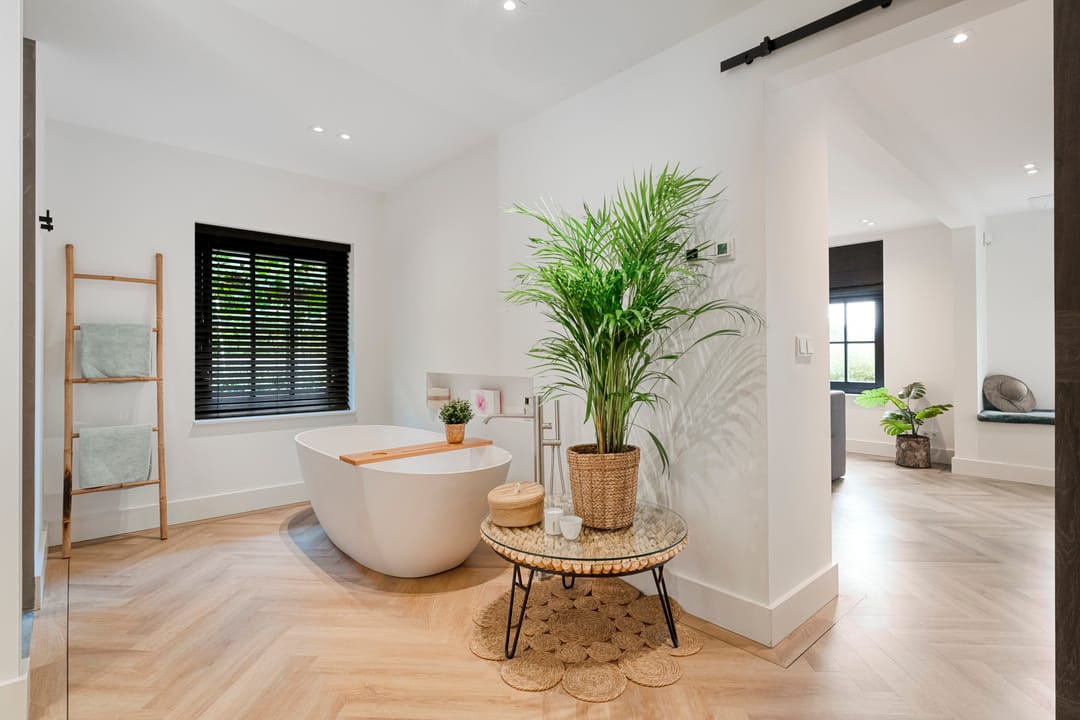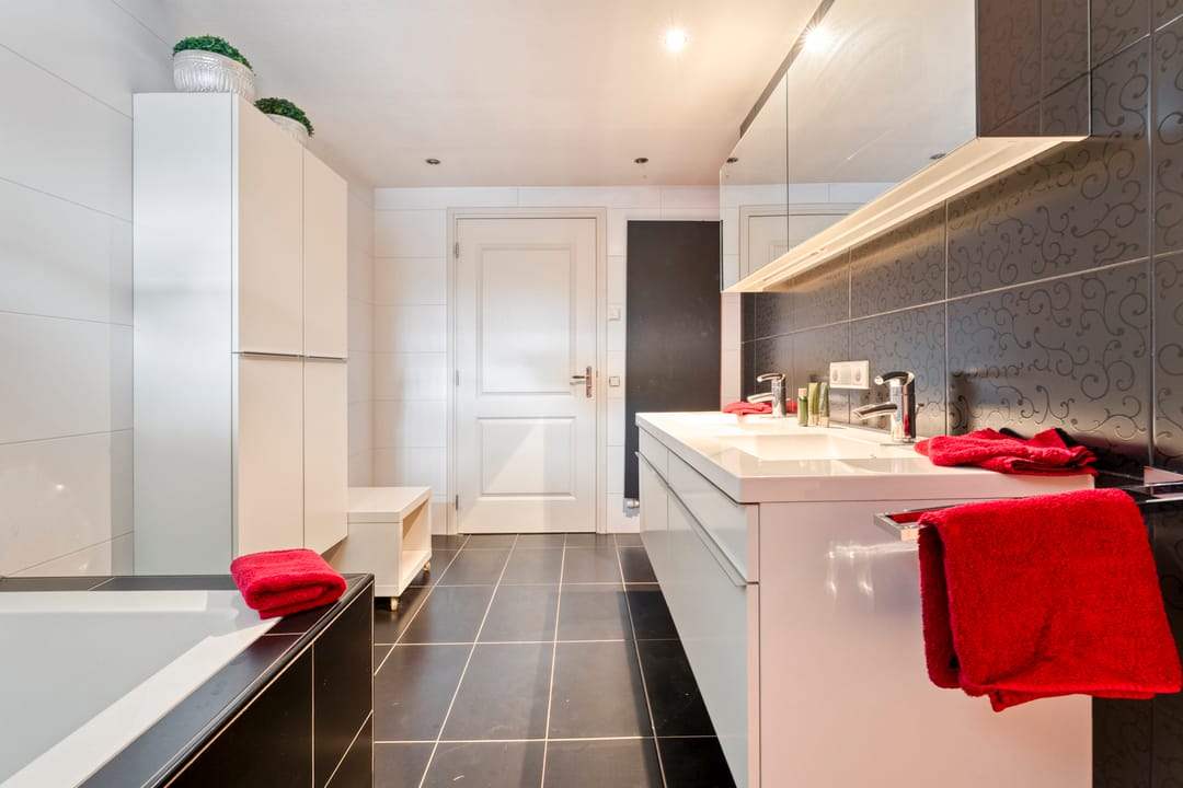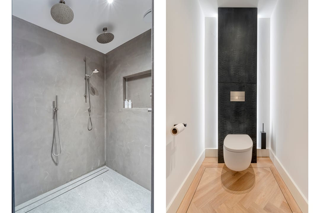 Master bedroom met design badkamer voorzien van dubbele douche, vrijstaand bad, toilet en badkamermeubel.