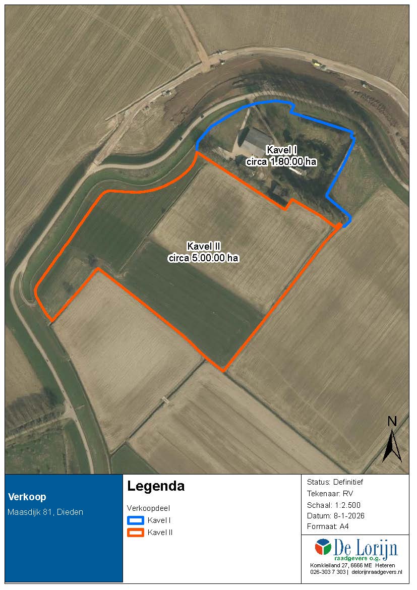 Kavel landbouwgrond van circa 5 hectare in combinatie met de voormalige boerderij staande en gelegen aan de Maasdijk 81 te Dieden (kadastraal bekend gemeente Ravenstein, sectie C. nummer 1125 (ged.).