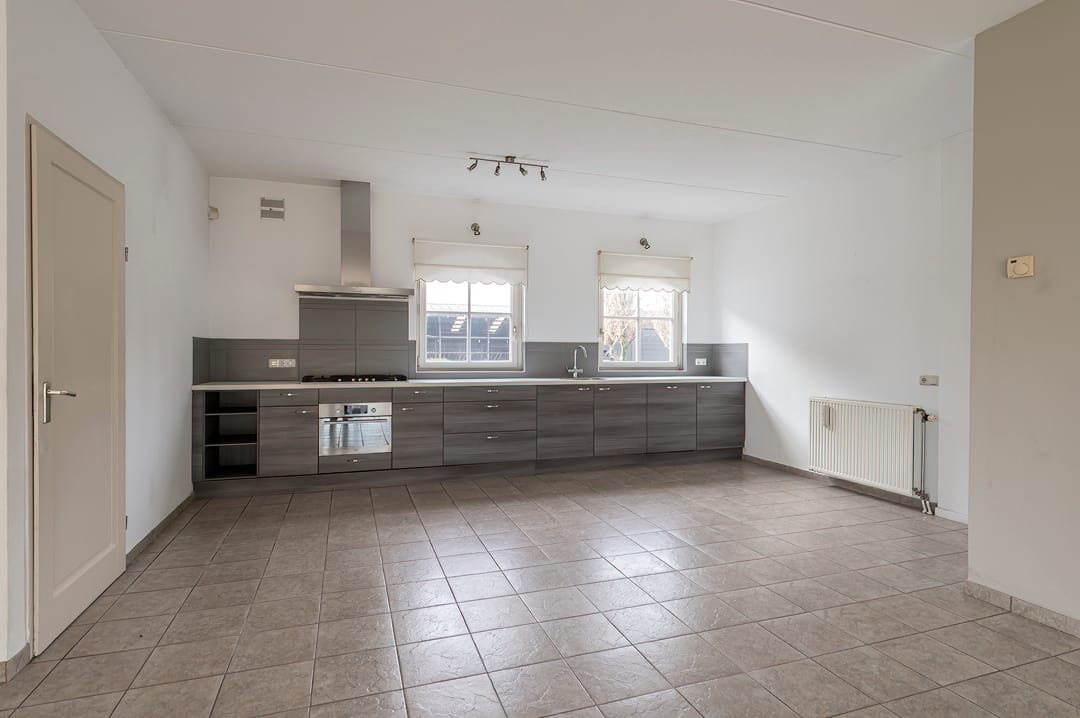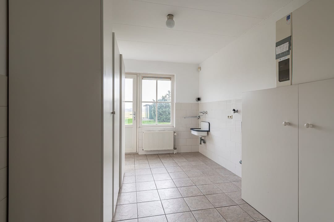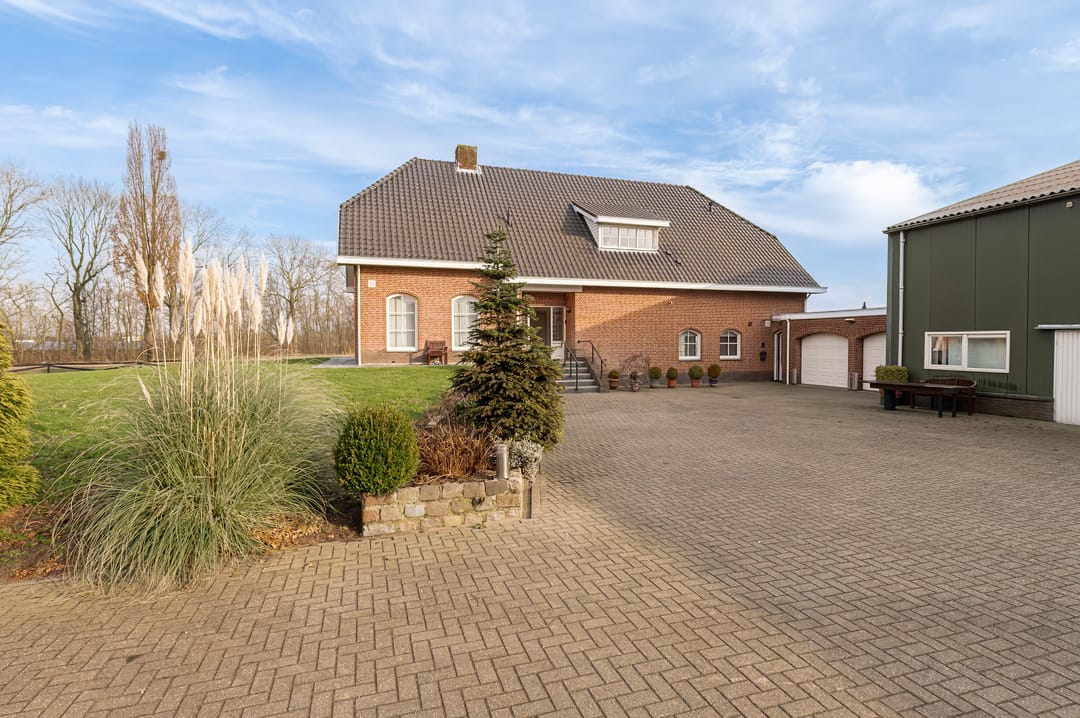 De agrarische bedrijfswoning is volledig traditioneel gebouwd van stenen spouwmuren met kunststof kozijnen en ramen met dubbele beglazing. De vloeren zijn van beton en de geïsoleerde kap is met pannen belegd en voorzien van 2 dakkapellen en 2 wolfseinden. De riante opzet en woonoppervlakte van 353 m2 biedt op de begane grond onder andere ruimte aan: een dichte keuken; een straatgerichte woonkamer met gashaard en openslaande deuren naar de overkapping; een 2e woonkamer met open keuken; 3 (slaap)kamers; een badkamer en 2 separate toiletten. Op de verdieping zijn 4 slaapkamers en een 2e badkamer aanwezig. De bedrijfswoning leent zich in haar huidige indeling bijzonder goed voor dubbele bewoning/mantelzorg maar is eenvoudig weer geschikt te maken/gebruiken als 1 royale gezinswoning. Formeel is er sprake van 1 (bedrijfs)woning. Tussen de woning en de fruitloods is een eveneens traditioneel gebouwde royale dubbele garage aanwezig die binnendoor bereikbaar is.