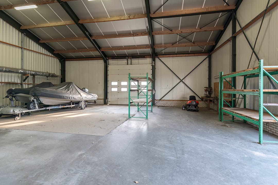 De Veestal/opslagruimte/werktuigenberging is gebouwd is gebouwd op een onderheide betonnen ringbalk. De gevels zijn grotendeels voorzien van een betonnen borstwering en stalen profielplaten. De zadelkap is voorzien van asbestvrije golfplaten. De spanten en hekwerken zijn gegalvaniseerd. De schuur/loods is momenteel in drieën gedeeld. Het eerste deel is gebruikt als open front veestal (stieren) van het type potstal. Het tweede deel betreft een afgesloten machine berging voorzien van 3 overheaddeuren en een loopdeur. Het derde deel betreft een open machineberging. tweeën gedeeld. Het gedeelte dat aan de woning grenst is voorzien van inpandige kantoor-/kantineruimte en toegankelijk door middel van 2 overheaddeuren en een loopdeur. De totale oppervlakte van deze schuur/loods bedraagt circa 1.160 m2 (14,50x80 m).