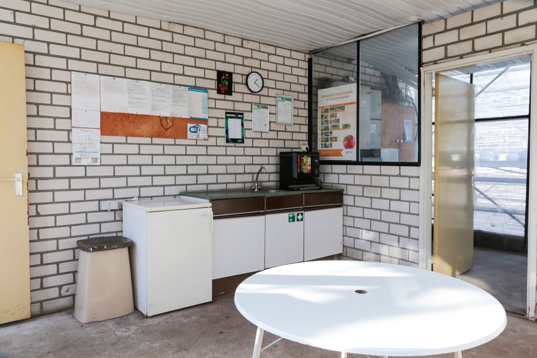 In de bedrijfsloods bevinden zich een koelcel, toilet, handenwasgelegenheid, drinkwatervoorziening, telefoonaansluiting en de afsluiter van het elektra. Vanuit de bedrijfsloods is de eerste kas bereikbaar. Een deel van deze kas is ingericht met het ketelhuis, de kantine, de computerruimte met klimaatcomputer, telefoon- en internetaansluiting en de gewasbeschermingsmiddelenkast. Ook bevindt zich hier de substraatunit met opslag van de meststoffen.