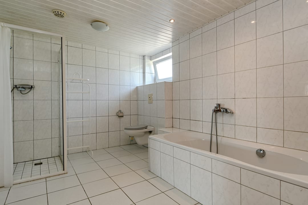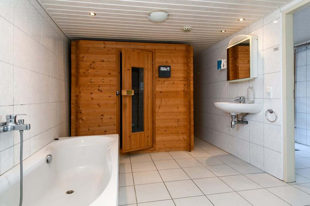 Aan de zijkant van de woning bevindt zich een deur welke toegang biedt middels een gang tot de grootste badkamer welke geheel is betegeld en beschikt over een ligbad, douche, wasbak en sauna. Vanuit deze gang is ook tweede woonkamer bereikbaar die ook weer toegang bied tot de bovengenoemde bijkeuken.