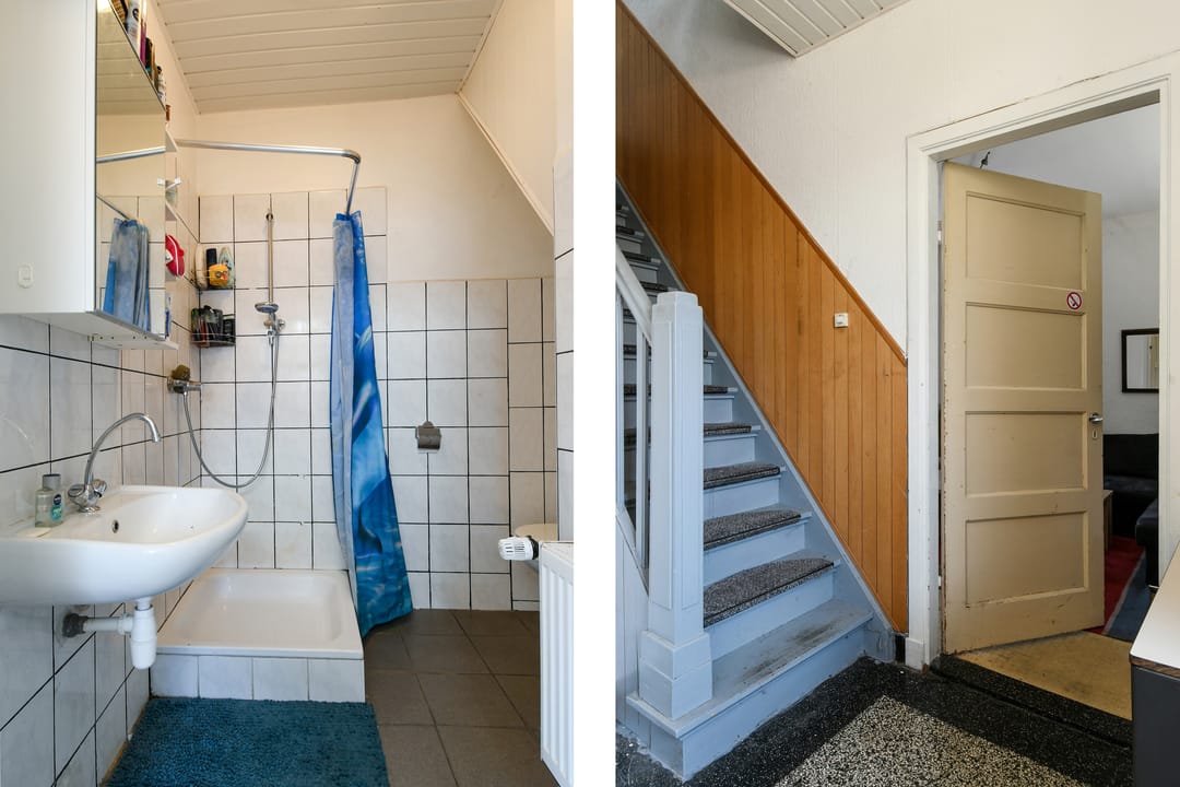De eerste verdieping (hout) is bereikbaar via de trapopgang in de hal.