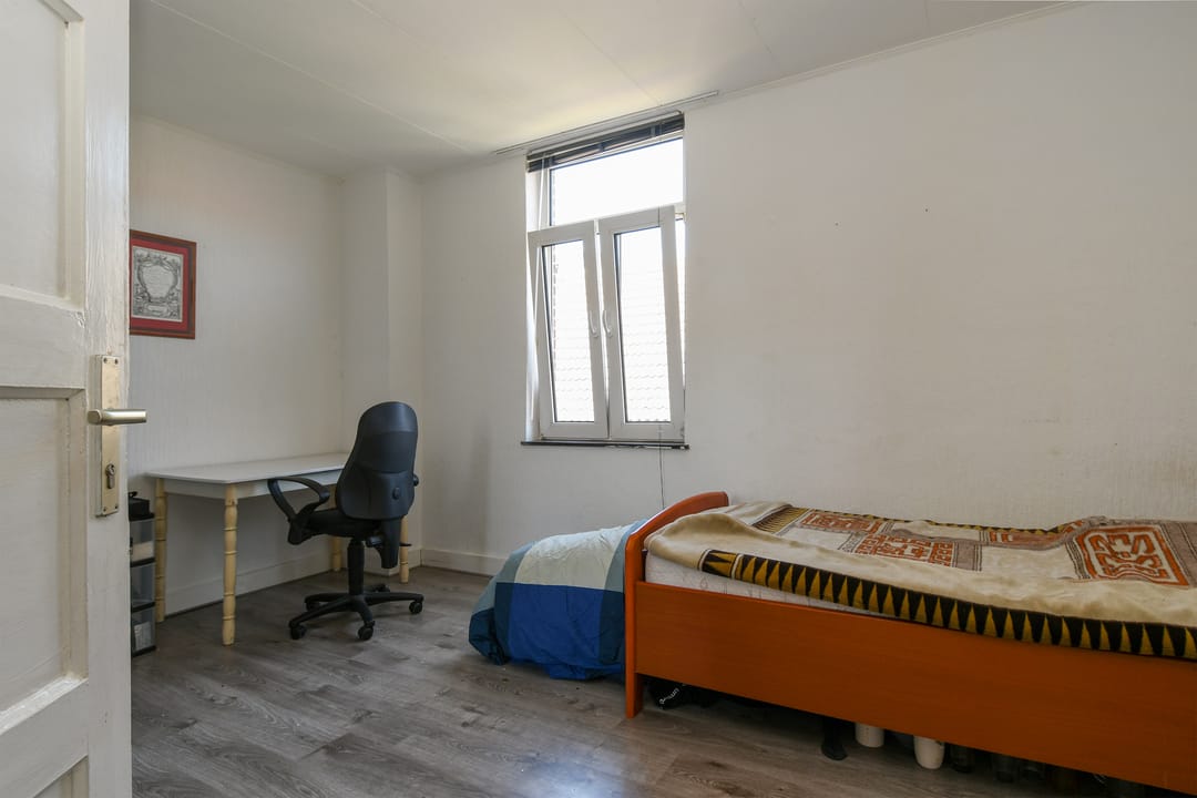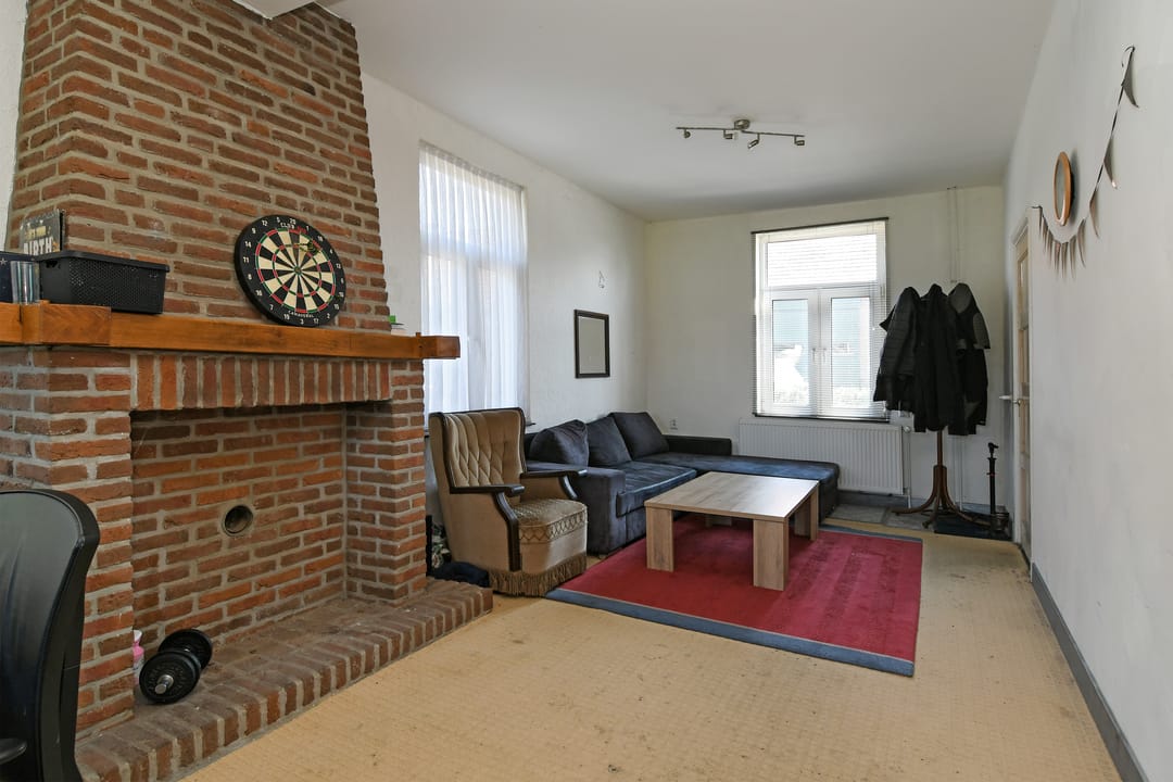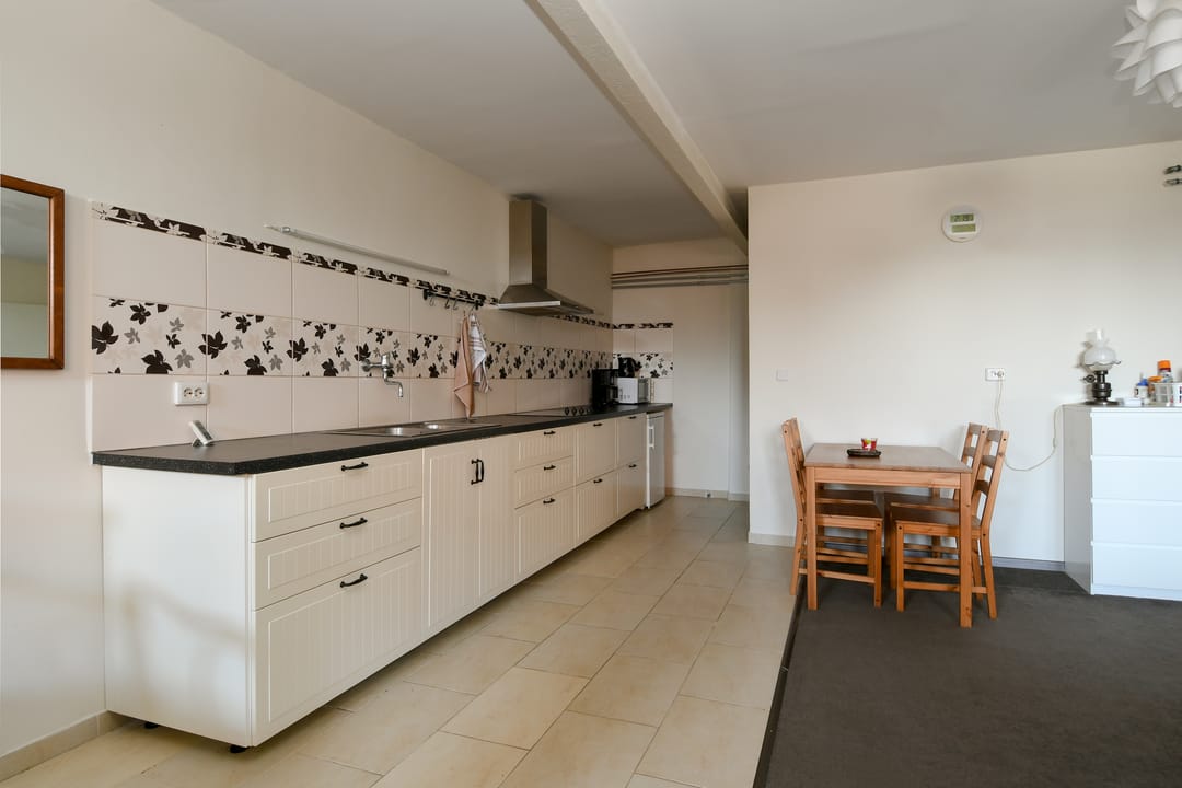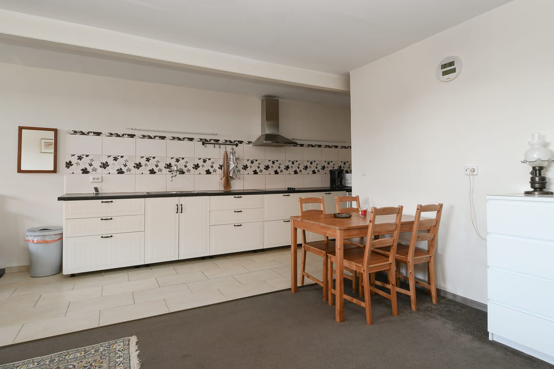 Via de achterdeur aan de achterzijde van de woning is een kleine badkamer met toilet, berging, bijkeuken en slaapkamer bereikbaar. Vanuit de bijkeuken is de tweede woonkamer toegankelijk. Deze woonkamer is ook voorzien van vloerbedekking en een open keuken omringd door tegels.