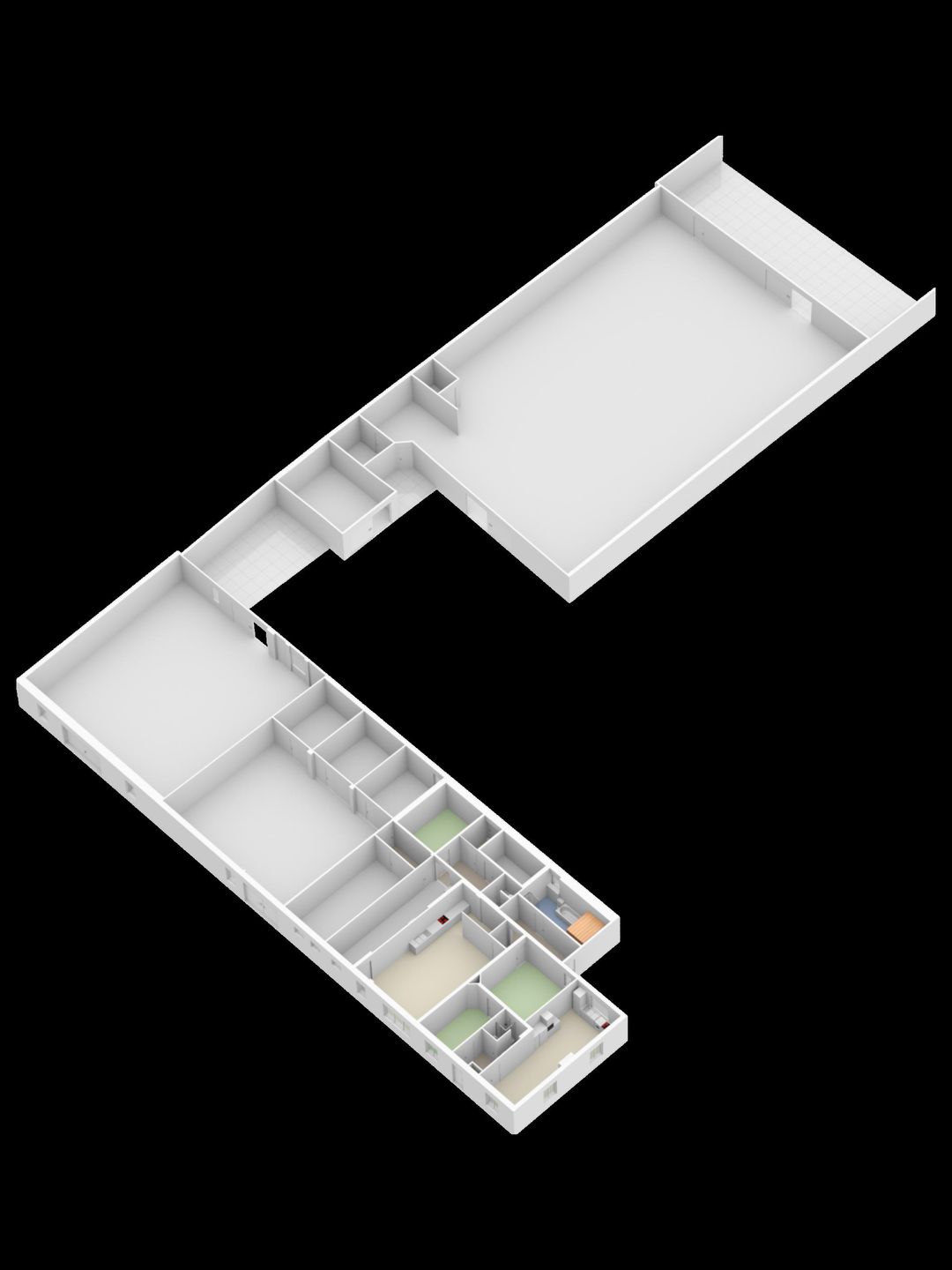 Aansluitend is de grote loods gerealiseerd. De loods bestaat uit stalen spanten (met staanders en trekstangen) en houten gordingen. Het dak is gedekt met damwand platen. Vloer is deels gestort beton, deels klinkers en deels zand.