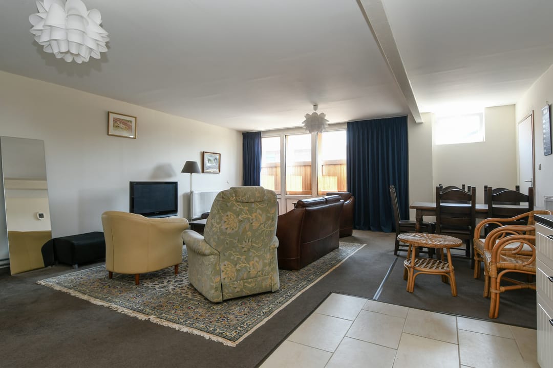 Hal/entree geeft toegang tot één van de 2 woonkamers, één van de 3 slaapkamers en één van de 3 badkamers die zich allen op de begane grond bevinden. De woonkamer is voorzien van vloerbedekking en beschikt over een open keuken omringd door een tegelvloer. De half betegelde badkamer bevindt zich gedeeltelijk onder de trapopgang naar de eerste verdieping en heeft een douche, wasbak en toilet. Vanuit de slaapkamer aan de voorzijde is de tweede slaapkamer bereikbaar.