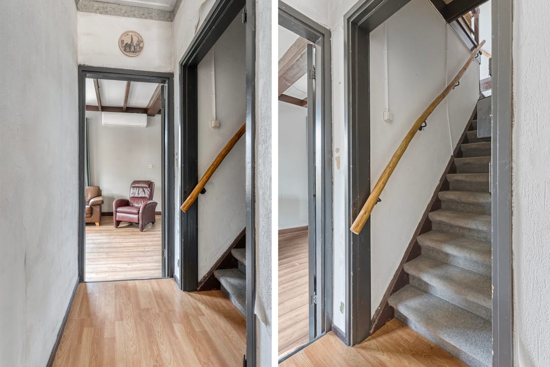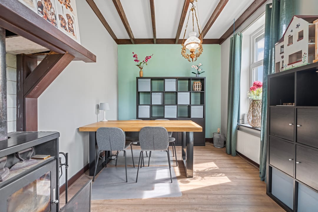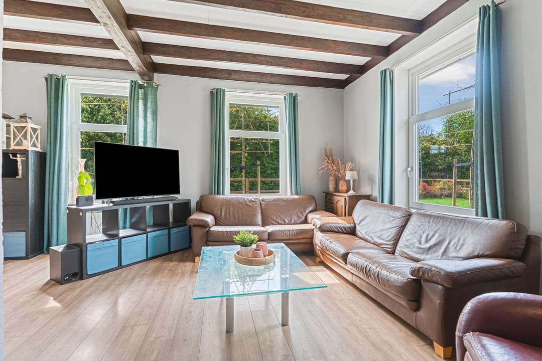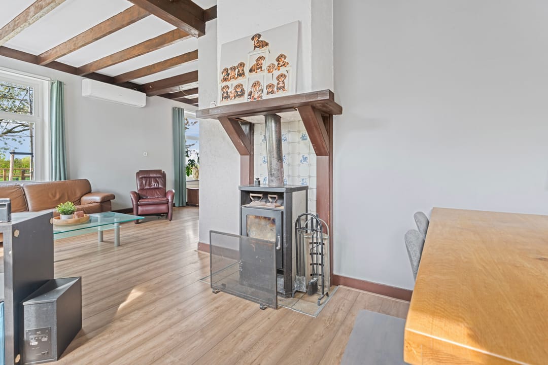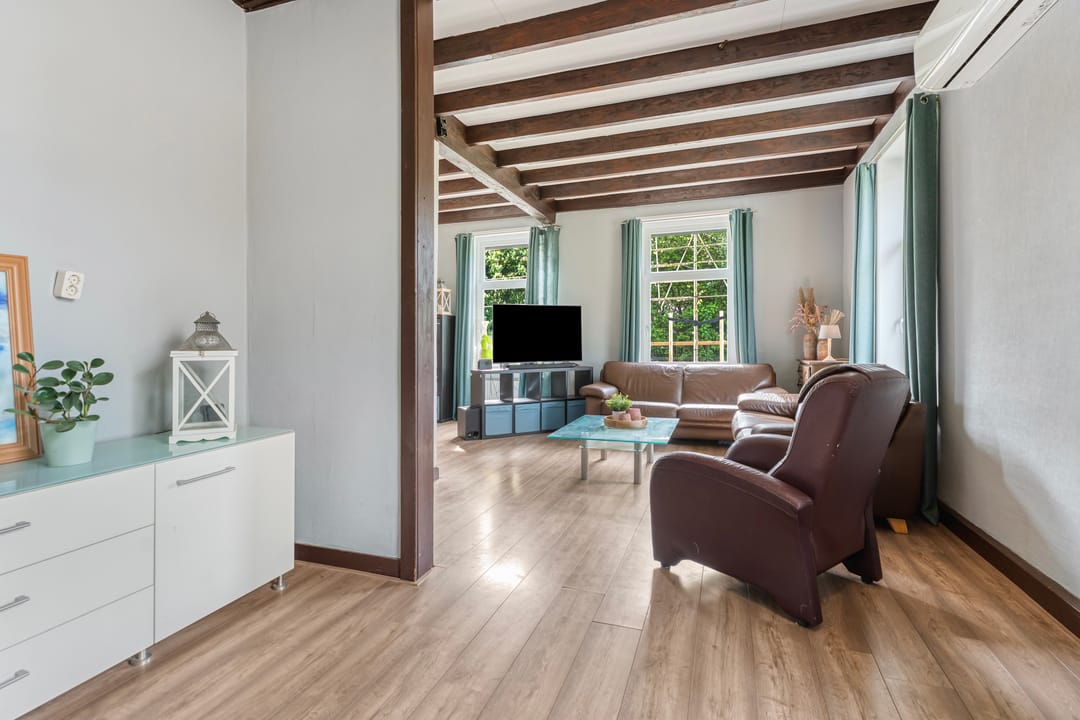 Via de zijkant van de woning kom je binnen in de ruime entree, met toegang tot zowel de eerste verdieping als de leefruimtes. De woonkamer is licht dankzij de vele raampartijen en biedt uitzicht op de tuin en het omliggende groen. De houten plafondbalken en open haard geven de ruimte karakter.