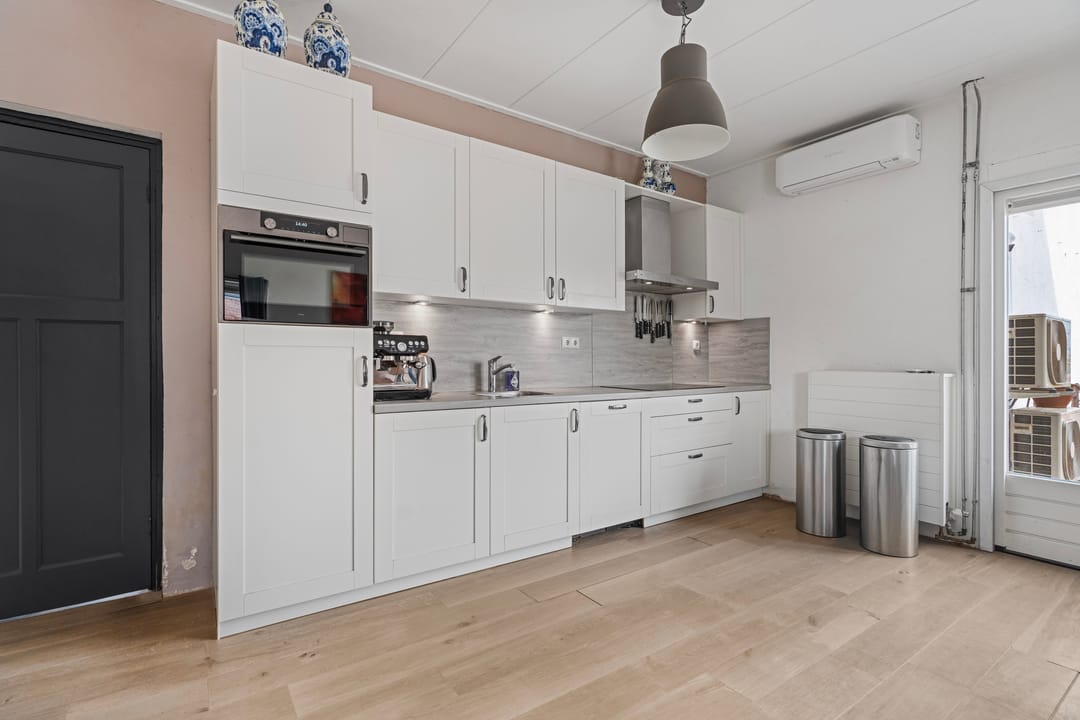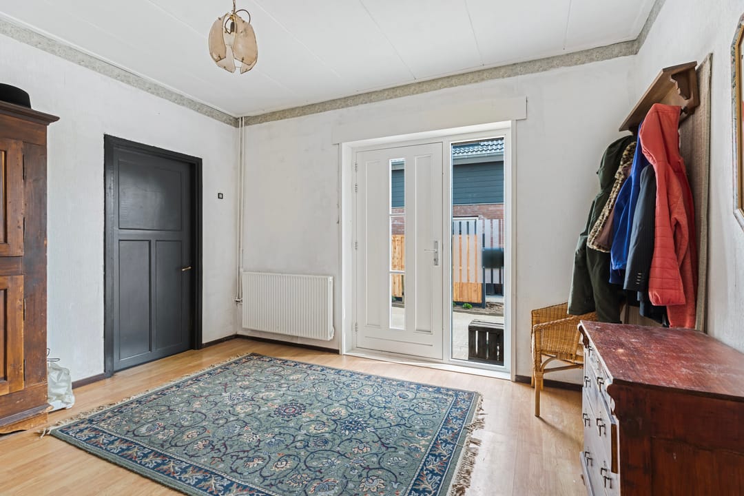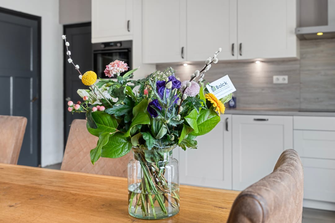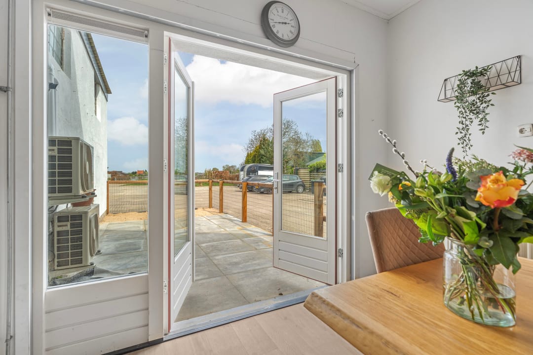 Via de hal bereik je de keuken. Deze is praktisch ingericht, voorzien van diverse inbouwapparatuur en biedt voldoende ruimte voor een grote eettafel. De openslaande deuren naar het betegelde terras aan de zijkant maken dit een fijne plek waar binnen en buiten in elkaar overlopen.