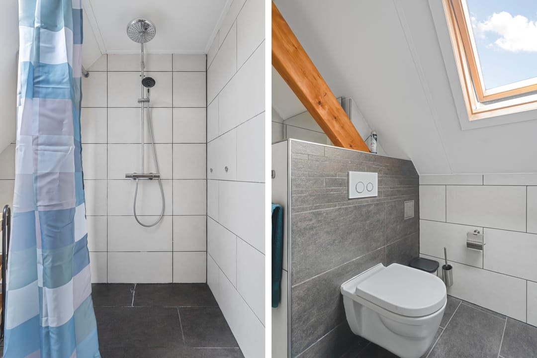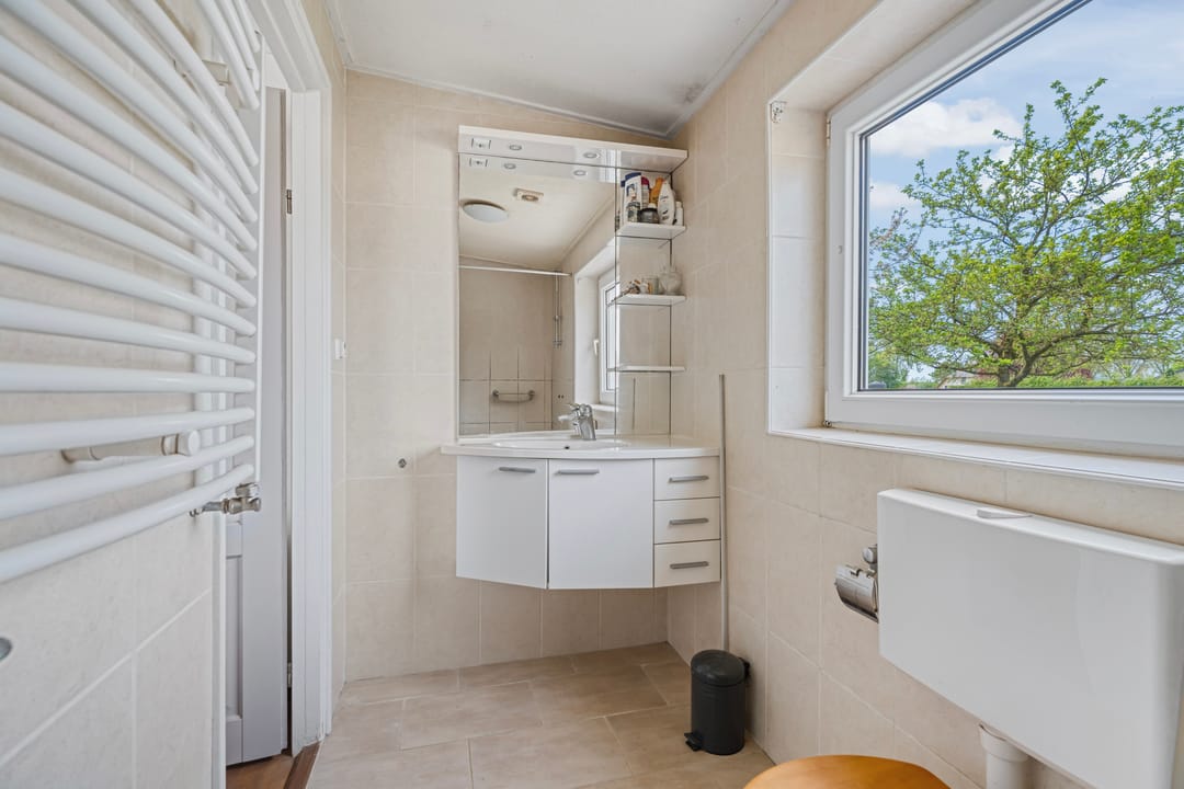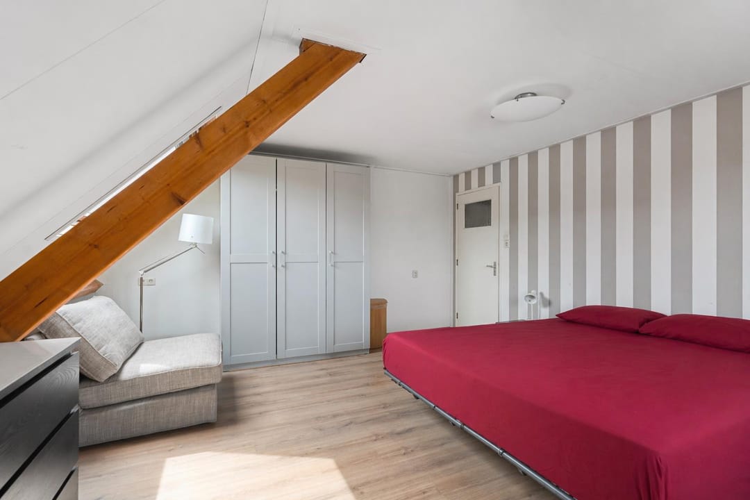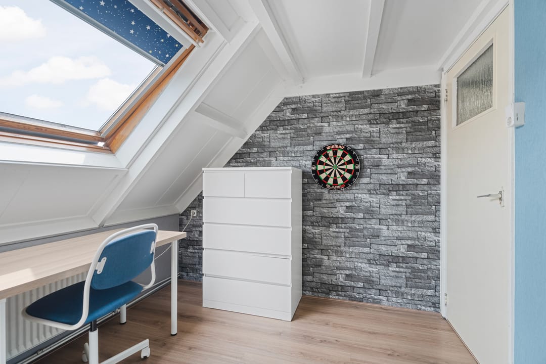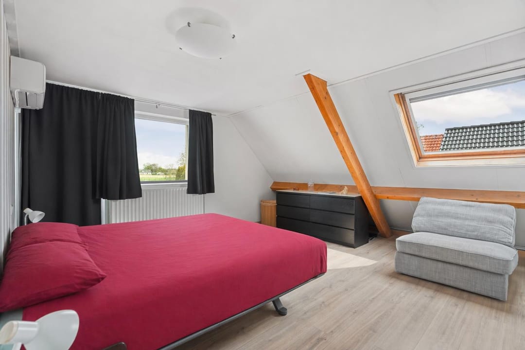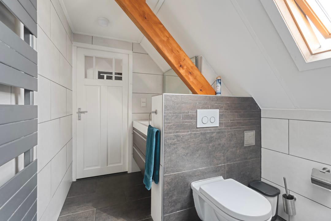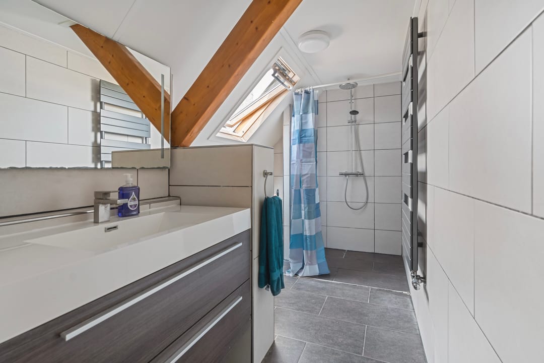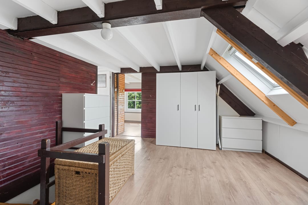 Op de eerste verdieping bevinden zich drie slaapkamers, elk met een prettig lichtinval dankzij de raampartijen en/of dakramen. De badkamer is netjes en functioneel ingericht met een douche, wastafel en toilet. De zichtbare kapconstructie en houten gebinten geven deze verdieping een sfeervolle uitstraling.