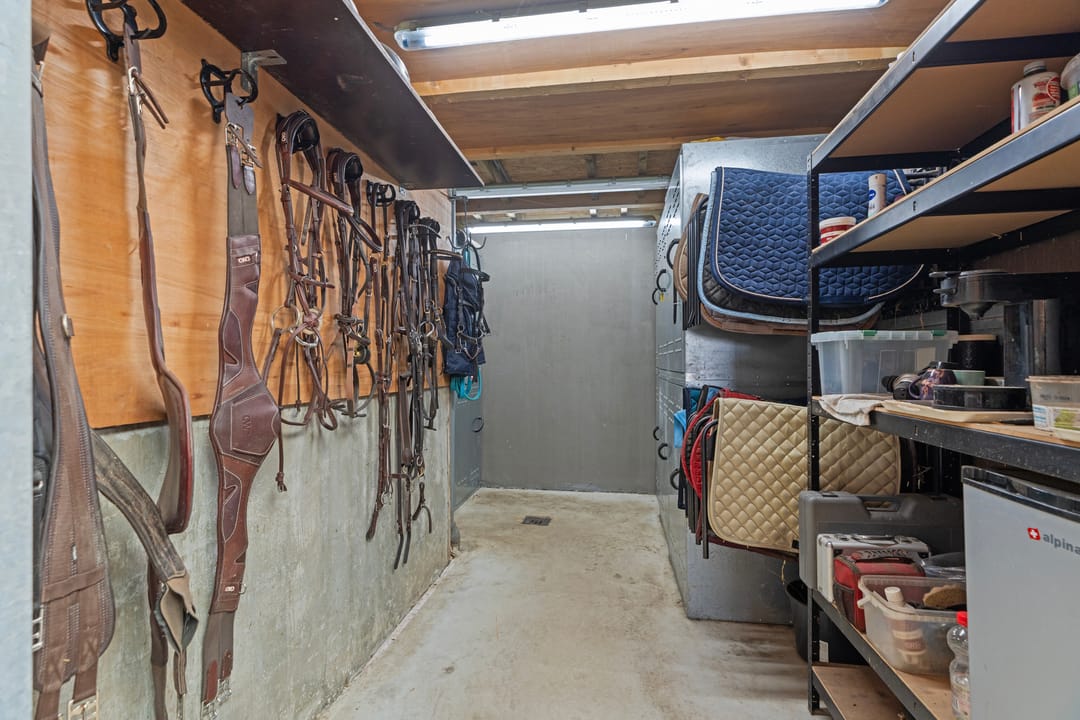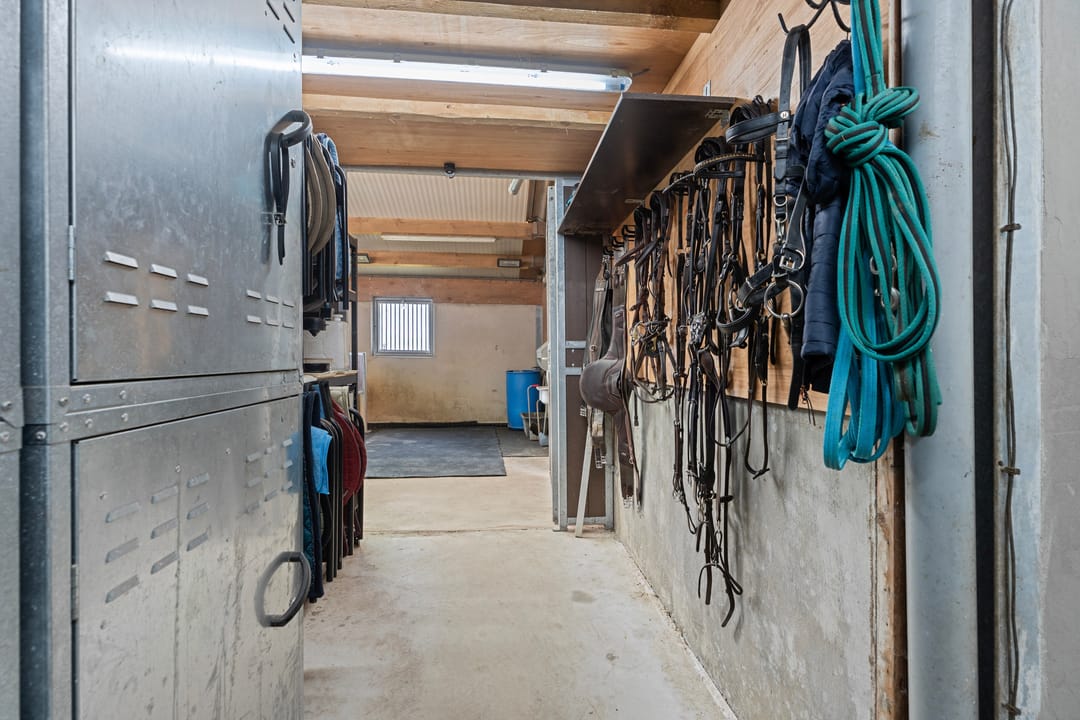 Aanvullend is er een dubbele wasplaats met rubberen vloer aanwezig en warm en koud water. De afsluitbare zadelkamer is uitgerust met 10 zadelkasten (ter overname) en biedt de mogelijkheid tot verwarmen. Zowel de zadelkamer als de individuele zadelkasten zijn afsluitbaar.