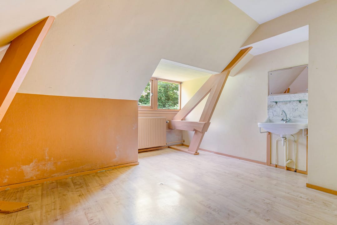 Gebouw met 2 verdiepingen (6 kamers), vliering, kelder en inpandige garage (momenteel is de toegang vanuit het gebouw niet in gebruik)