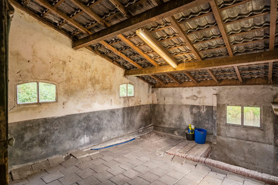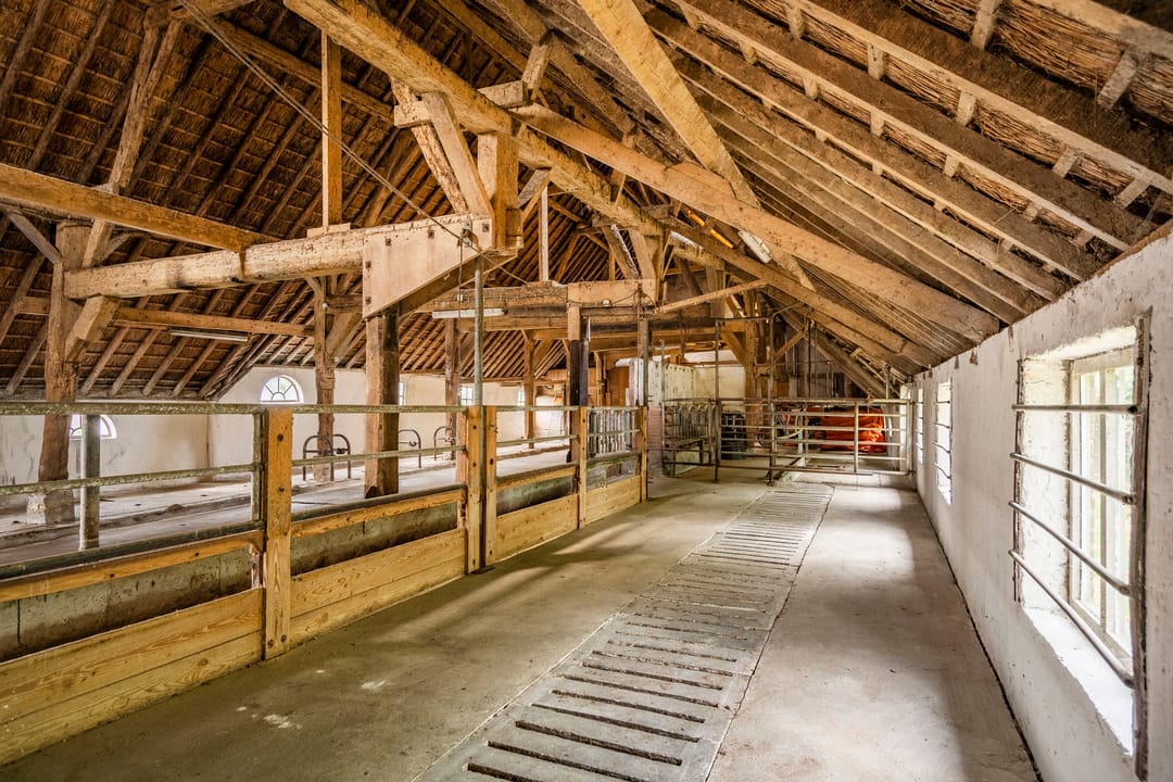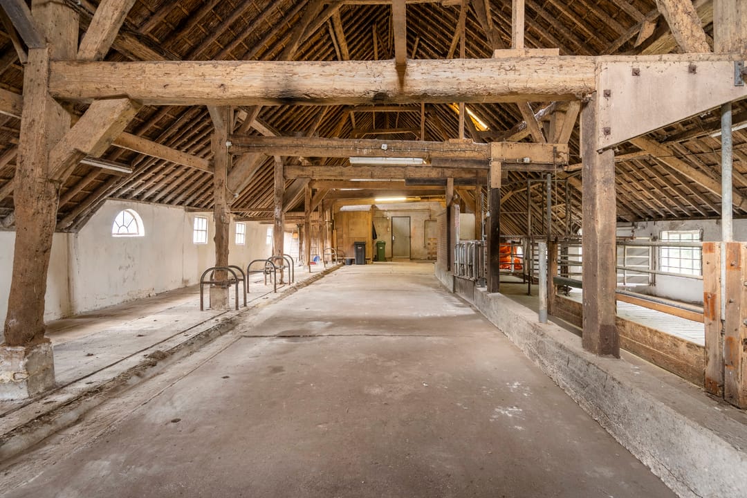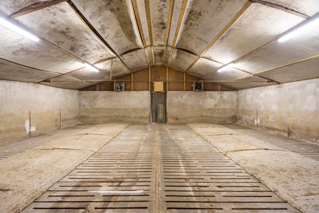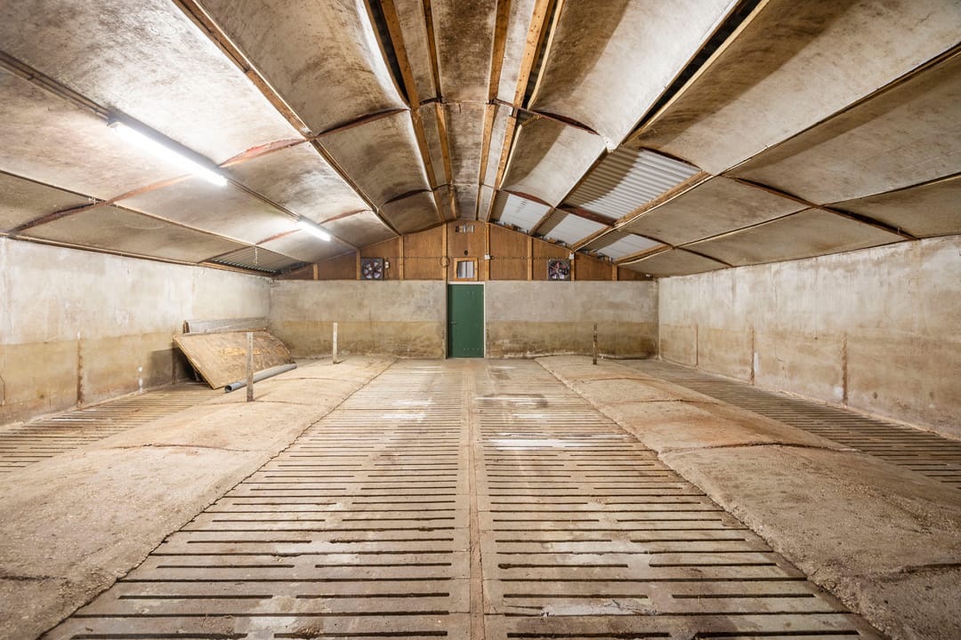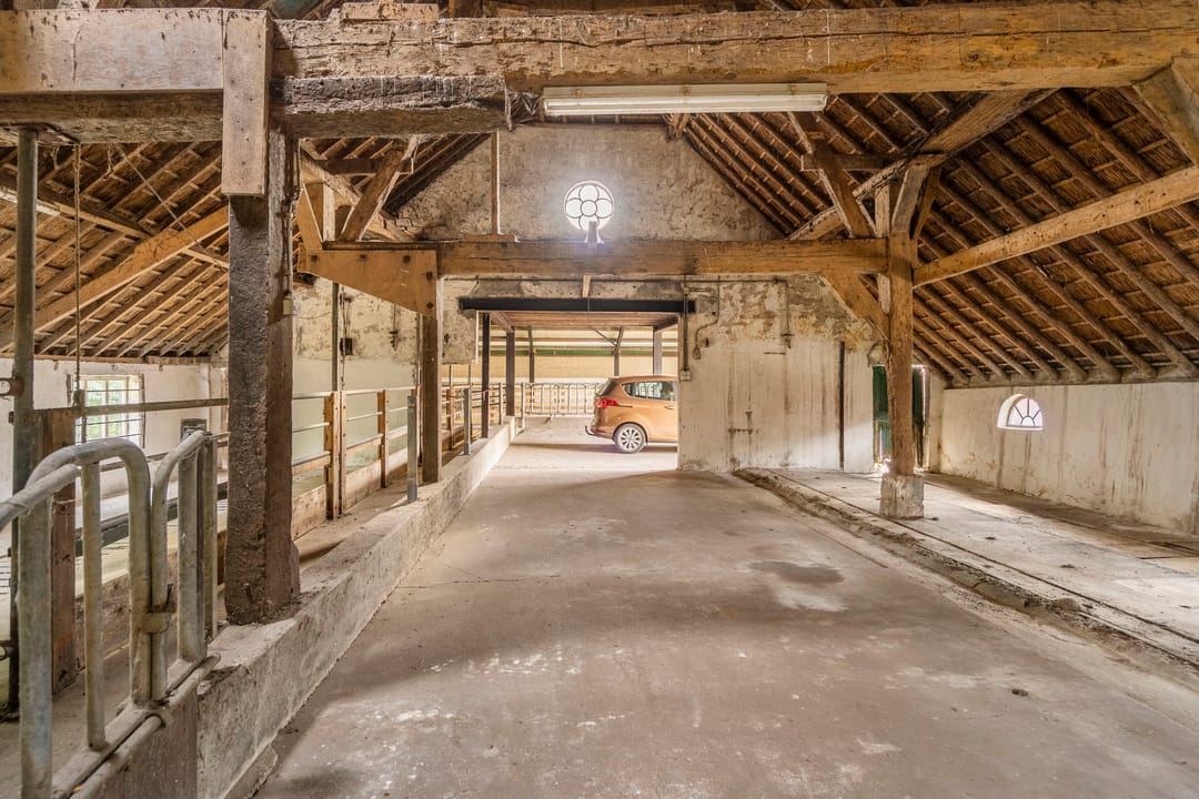 Aan de woning bevindt zich de voormalige veestalling die thans niet meer in gebruik is. Naar schatting is dit gebouw ongeveer 300 jaar oud. Het is opgetrokken uit steensmetselwerk en voorzien van een rietgedekte kap. Deze stal is via een tussenbouw verbonden aan de voormalige ligboxenstal (1985), opgetrokken uit spouwmetselwerk. De kap is gedekt met sandwichpanelen.