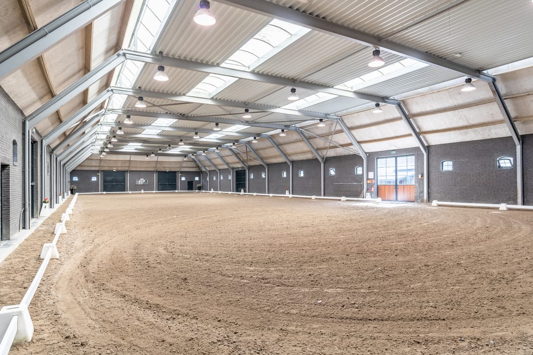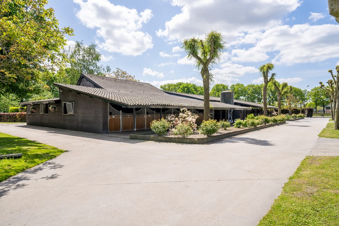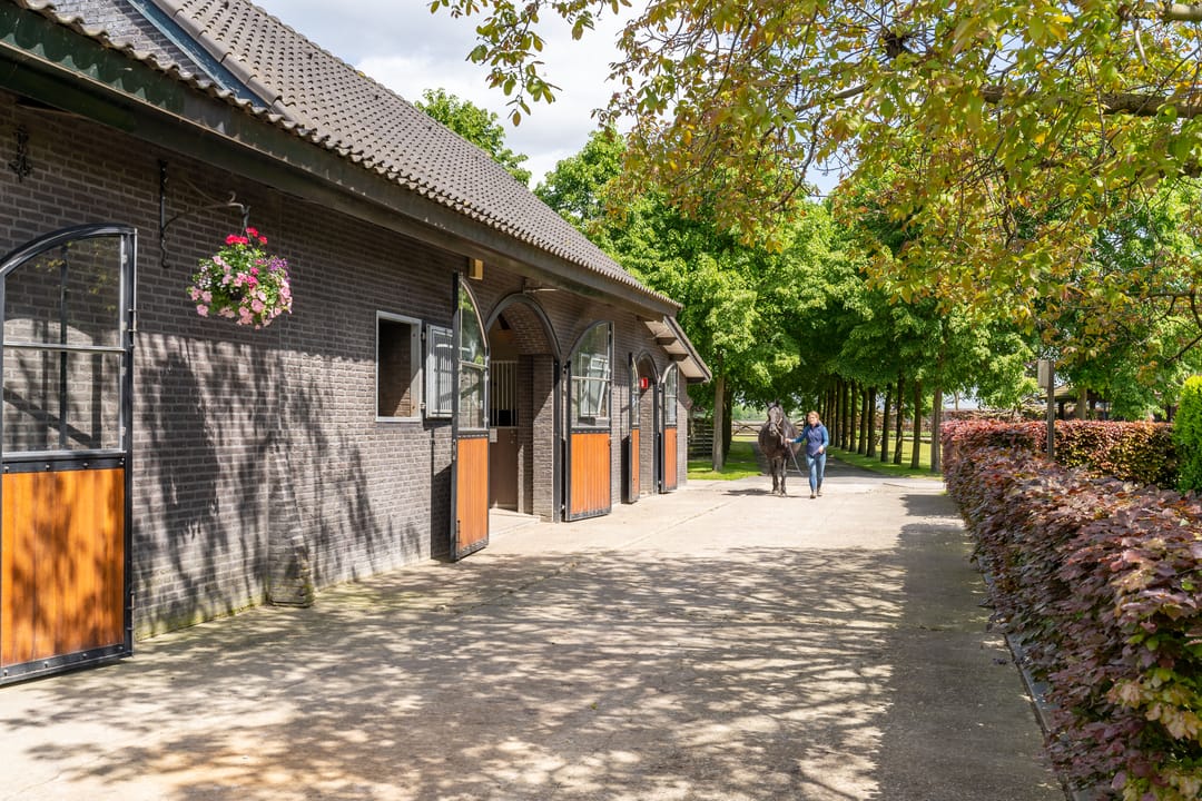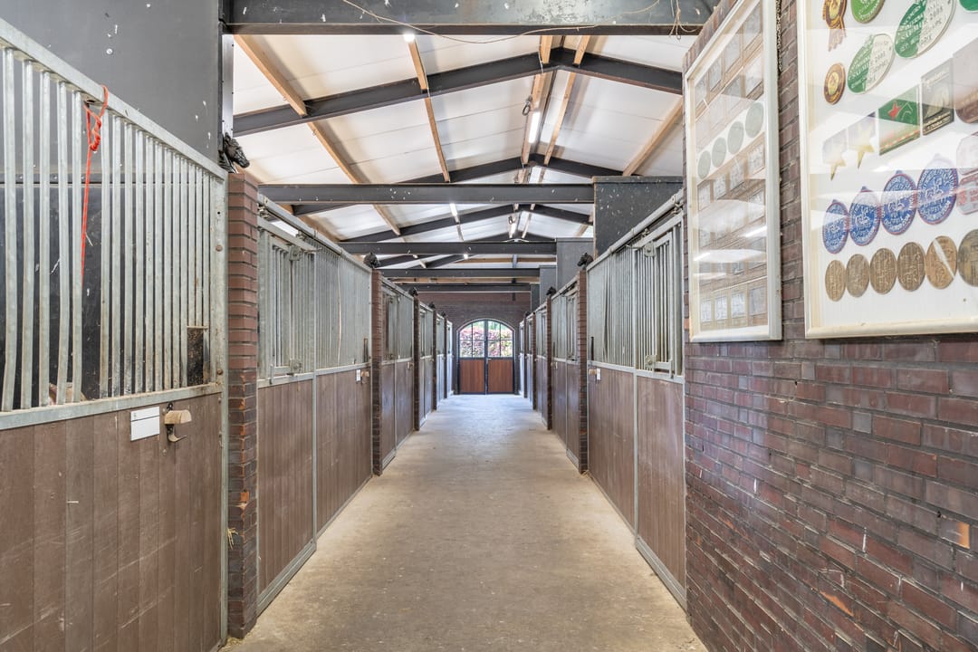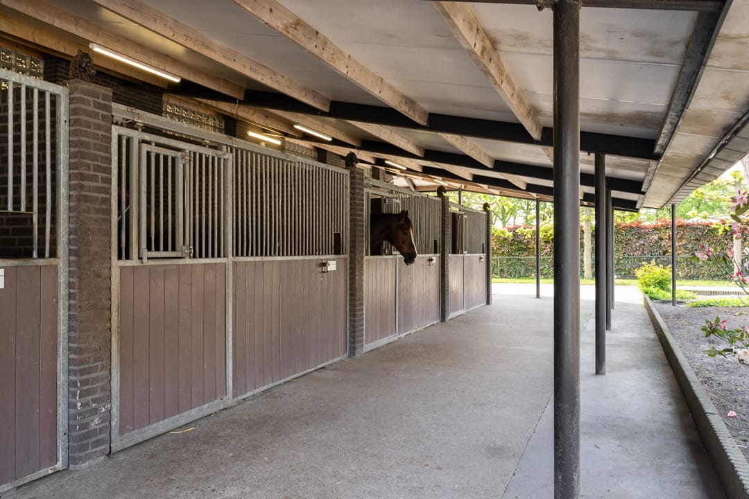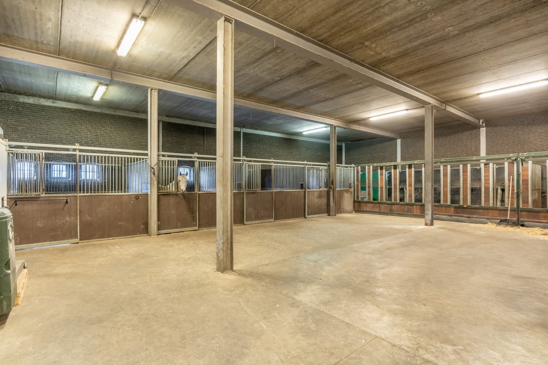 De paardenstal is verder verdeeld in 3 units met in totaal 20 paardenboxen. De geïsoleerde stal is opgetrokken uit metselwerk met stalen spanten en ook hier is het dak met pannen gedekt. Openslaande deuren bieden vanuit alle units toegang tot het erf. Naast 11 paardenboxen zijn in de eerste stalunit nog 4 wasplaatsen, een zadelkamer, een wasruimte en een toiletruimte gesitueerd. De boxen (ca. 4x4 mtr.) zijn voorzien van deels kunststof en deels gegalvaniseerde voorwanden met schuifdeuren en metselwerk tussenwanden. 6 Boxen beschikken over een buitenluik. Stalgedeelte II beschikt over 6 paardenboxen (ca. 4x4 mtr.) met deels kunststof en deels gegalvaniseerde voorwanden met schuifdeuren en betonnen tussenwanden. De unit is verder voorzien van sfeervolle houten gebinten. In het derde stalgedeelte zijn nog 3 boxen aanwezig, welke allen beschikken over een buitenluik. De boxen zijn voorzien van deels kunststof en deels gegalvaniseerde voorwanden met schuifdeuren en betonnen tussenwanden.