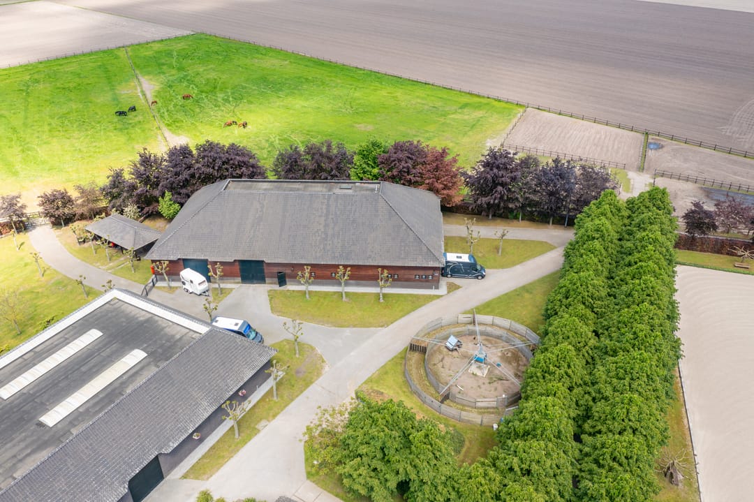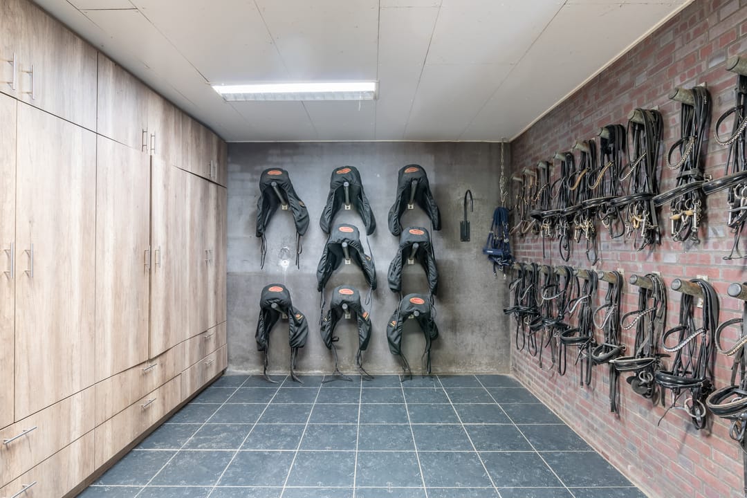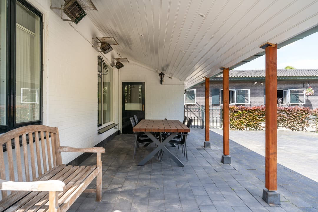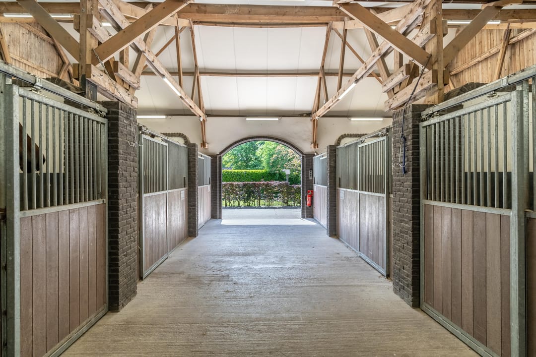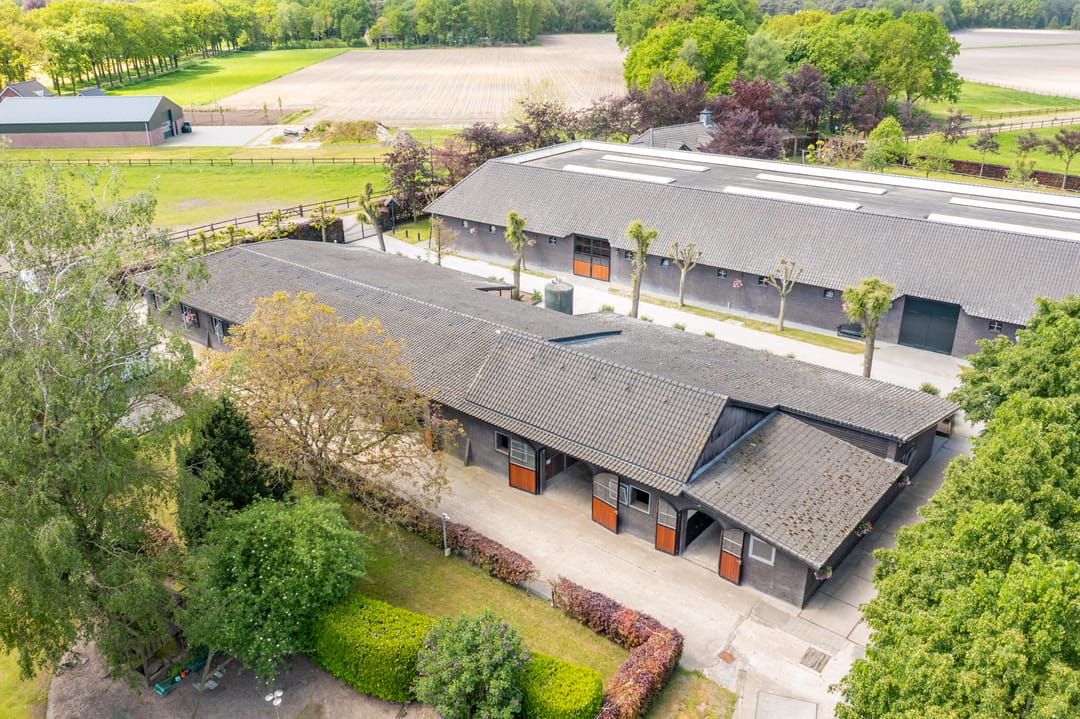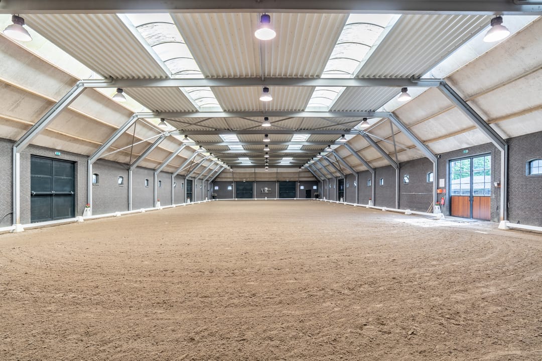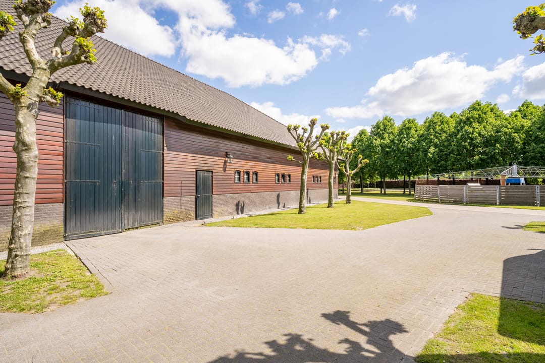 De paardenstal is verder verdeeld in 3 units met in totaal 20 paardenboxen. De geïsoleerde stal is opgetrokken uit metselwerk met stalen spanten en ook hier is het dak met pannen gedekt. Openslaande deuren bieden vanuit alle units toegang tot het erf. Naast 11 paardenboxen zijn in de eerste stalunit nog 4 wasplaatsen, een zadelkamer, een wasruimte en een toiletruimte gesitueerd. De boxen (ca. 4x4 mtr.) zijn voorzien van deels kunststof en deels gegalvaniseerde voorwanden met schuifdeuren en metselwerk tussenwanden. 6 Boxen beschikken over een buitenluik. Stalgedeelte II beschikt over 6 paardenboxen (ca. 4x4 mtr.) met deels kunststof en deels gegalvaniseerde voorwanden met schuifdeuren en betonnen tussenwanden. De unit is verder voorzien van sfeervolle houten gebinten. In het derde stalgedeelte zijn nog 3 boxen aanwezig, welke allen beschikken over een buitenluik. De boxen zijn voorzien van deels kunststof en deels gegalvaniseerde voorwanden met schuifdeuren en betonnen tussenwanden.