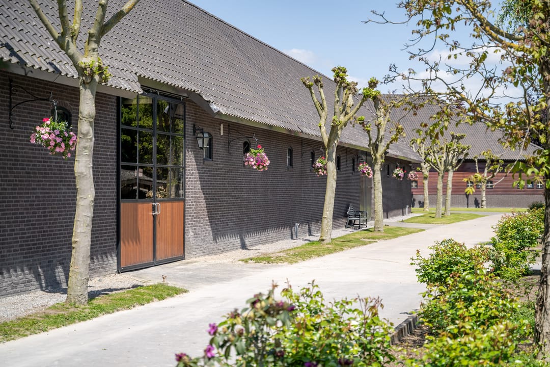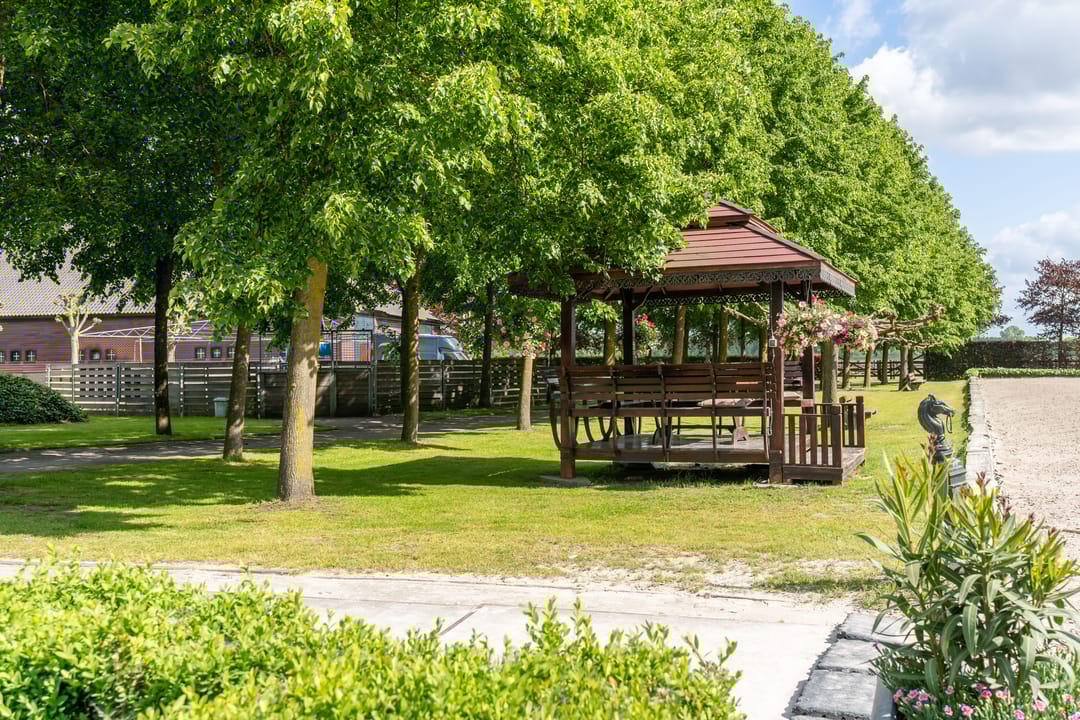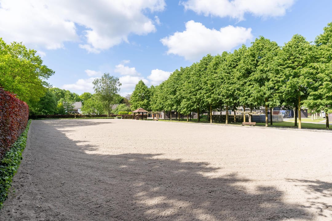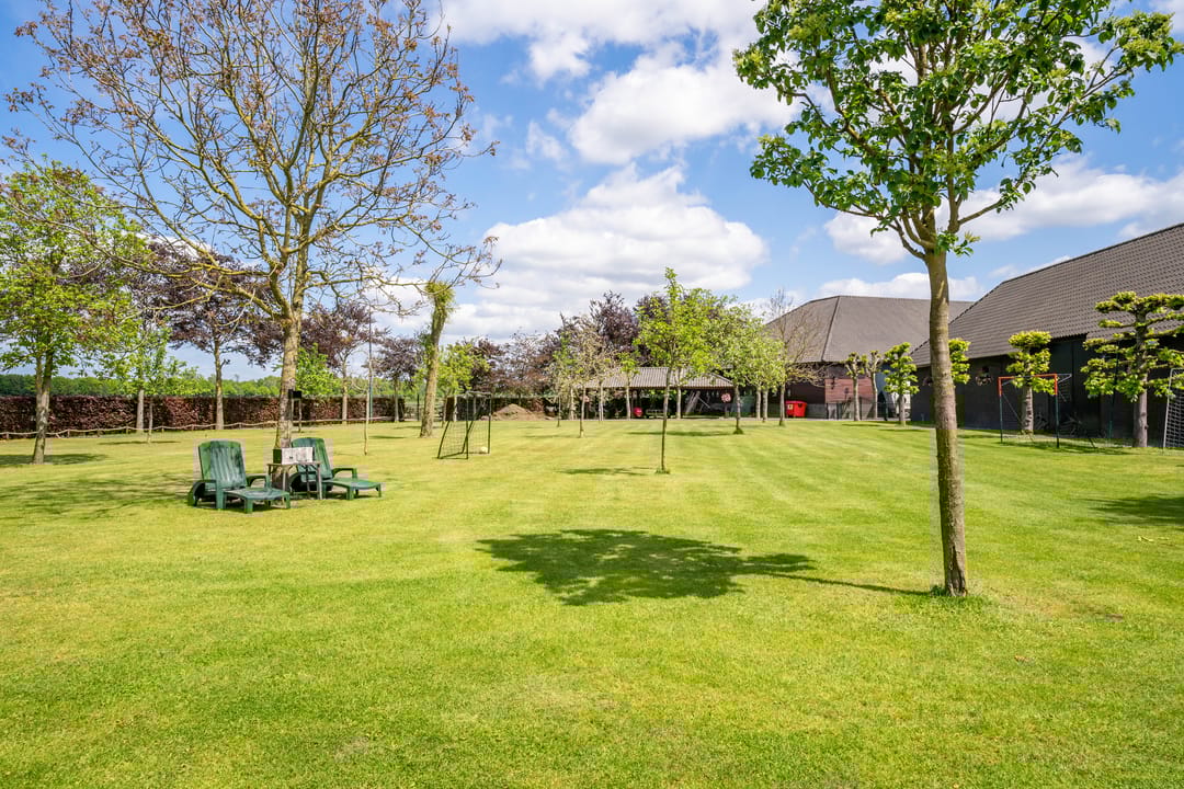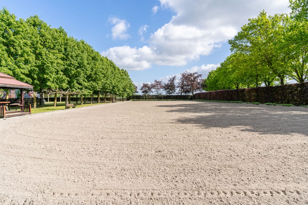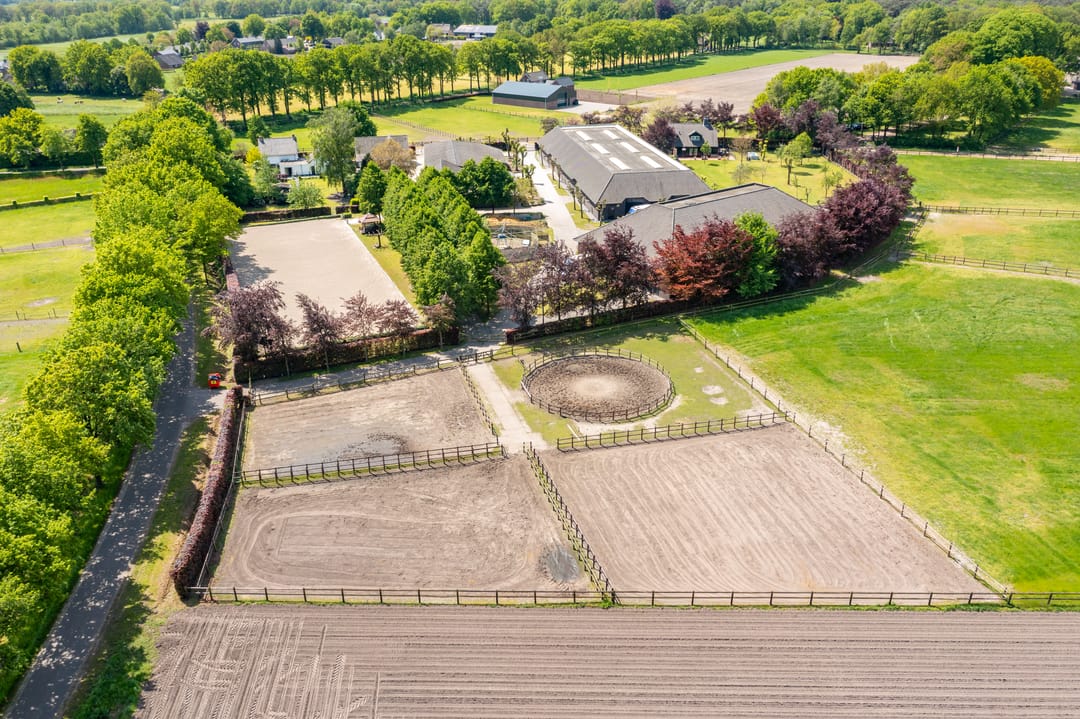 De paardenstal is verder verdeeld in 3 units met in totaal 20 paardenboxen. De geïsoleerde stal is opgetrokken uit metselwerk met stalen spanten en ook hier is het dak met pannen gedekt. Openslaande deuren bieden vanuit alle units toegang tot het erf. Naast 11 paardenboxen zijn in de eerste stalunit nog 4 wasplaatsen, een zadelkamer, een wasruimte en een toiletruimte gesitueerd. De boxen (ca. 4x4 mtr.) zijn voorzien van deels kunststof en deels gegalvaniseerde voorwanden met schuifdeuren en metselwerk tussenwanden. 6 Boxen beschikken over een buitenluik. Stalgedeelte II beschikt over 6 paardenboxen (ca. 4x4 mtr.) met deels kunststof en deels gegalvaniseerde voorwanden met schuifdeuren en betonnen tussenwanden. De unit is verder voorzien van sfeervolle houten gebinten. In het derde stalgedeelte zijn nog 3 boxen aanwezig, welke allen beschikken over een buitenluik. De boxen zijn voorzien van deels kunststof en deels gegalvaniseerde voorwanden met schuifdeuren en betonnen tussenwanden.