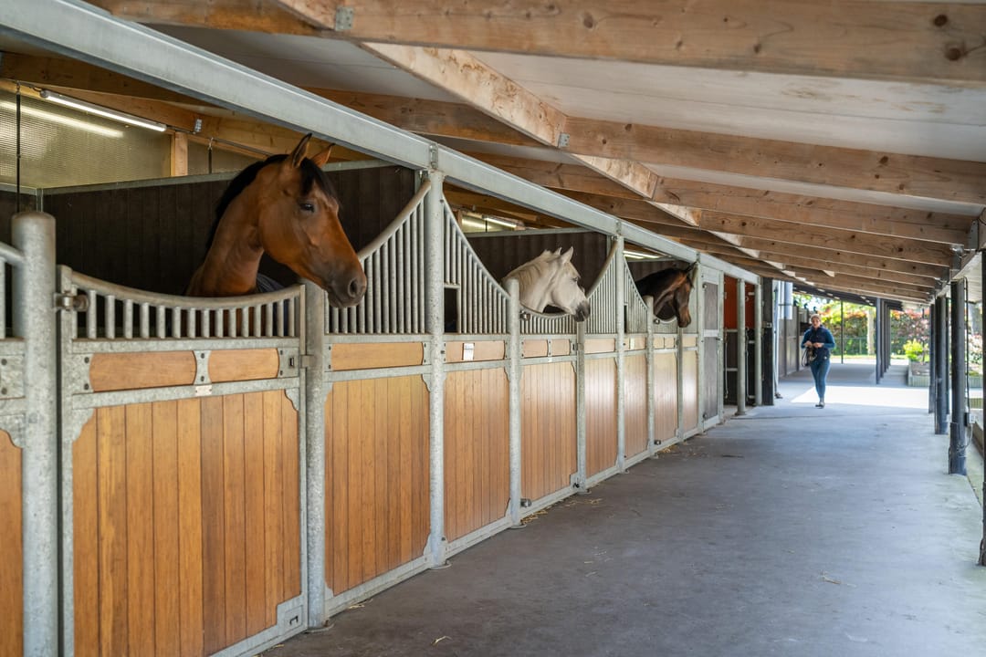 De 4 boxen (ca. 3x3,5 mtr.) aan de rechterzijde zijn voorzien van verlaagde bamboe voorwanden met draaideuren en kunststof tussenwanden. Deze stallen beschikken over 2 wasplaatsen, welke zijn voorzien van warmwater. Ook is er een berging aanwezig.