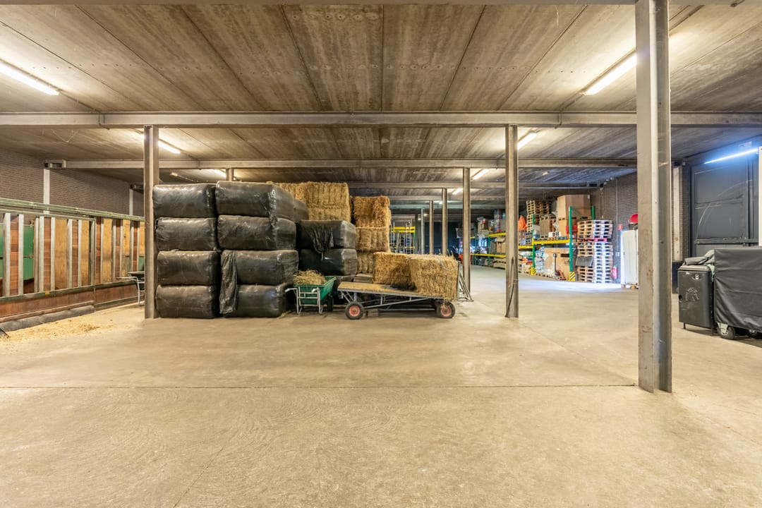 De zeer royale loods is op dit moment in gebruik als opslagruimte en deels ingericht met 5 paardenboxen en 2 loopstallen. Uiteraard is de loods voor meerdere doeleinden geschikt. De metselwerk gevels van de volledig geïsoleerde loods zijn aan de buitenzijde grotendeels gepotdekseld. Het dak is met pannen gedekt. Openslaande deuren in de voor- en zijgevel bieden toegang tot het erf. De merrie/veulenbox heeft een afmeting van ca. 5x5 mtr. en de overige 4 boxen zijn ca. 3x3,5 mtr. groot. De boxen zijn voorzien van deels kunststof en deels gegalvaniseerde voorwanden met schuifdeuren en kunststof tussenwanden. Een vaste trap zorgt voor toegang tot een riante zolder, welke is gesitueerd over de gehele oppervlakte van de loods.