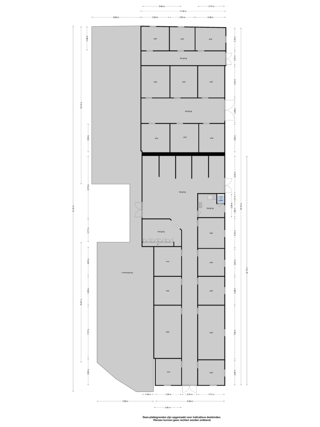 Aan de buitenzijde van de vrijstaande stal zijn 8 stallen gesitueerd, in 2 units van 4 boxen. De buitenstallen (ca 4x4 mtr.) aan de linkerzijde zijn voorzien van deels kunststof en deels gegalvaniseerde voorwanden met metselwerk tussen- en achterwanden en schuifdeuren.