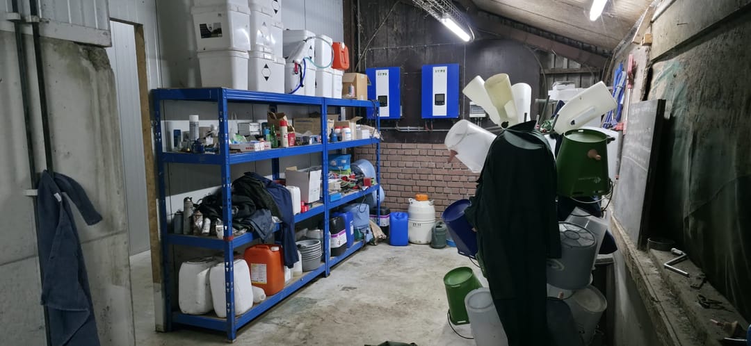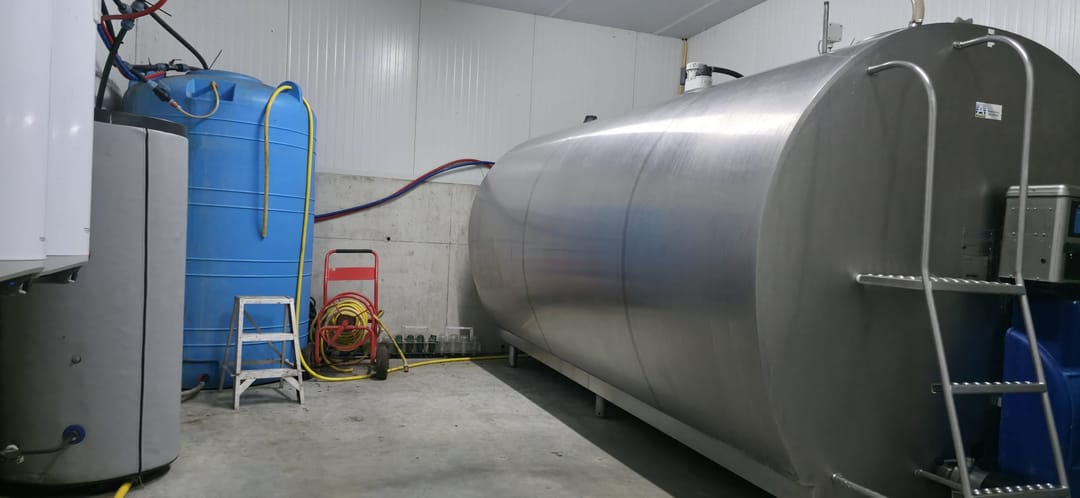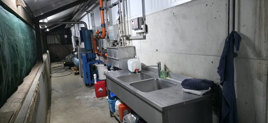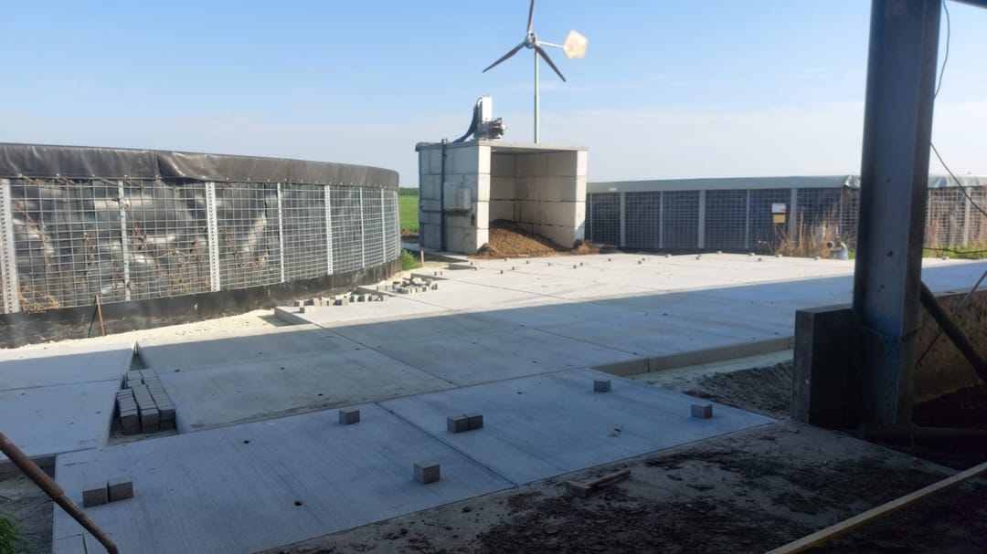 Tussen de mestsilo’s een mestafscheider (2024/2025) om de natte fractie van de droge te scheiden.
