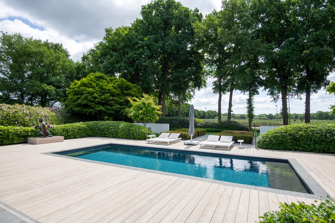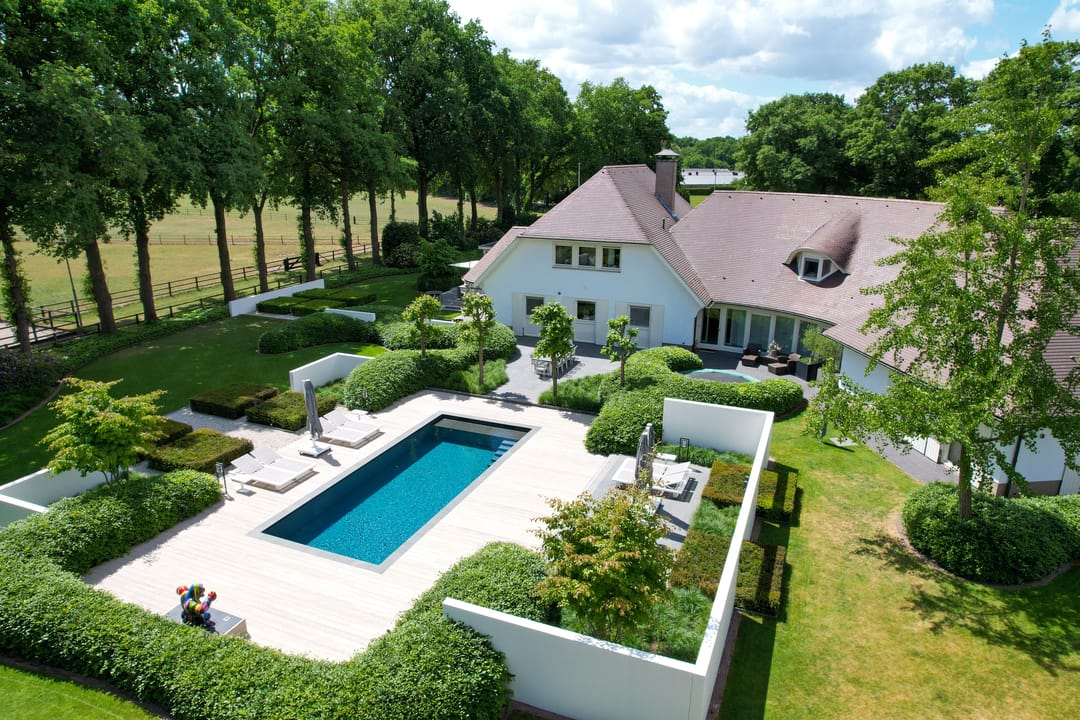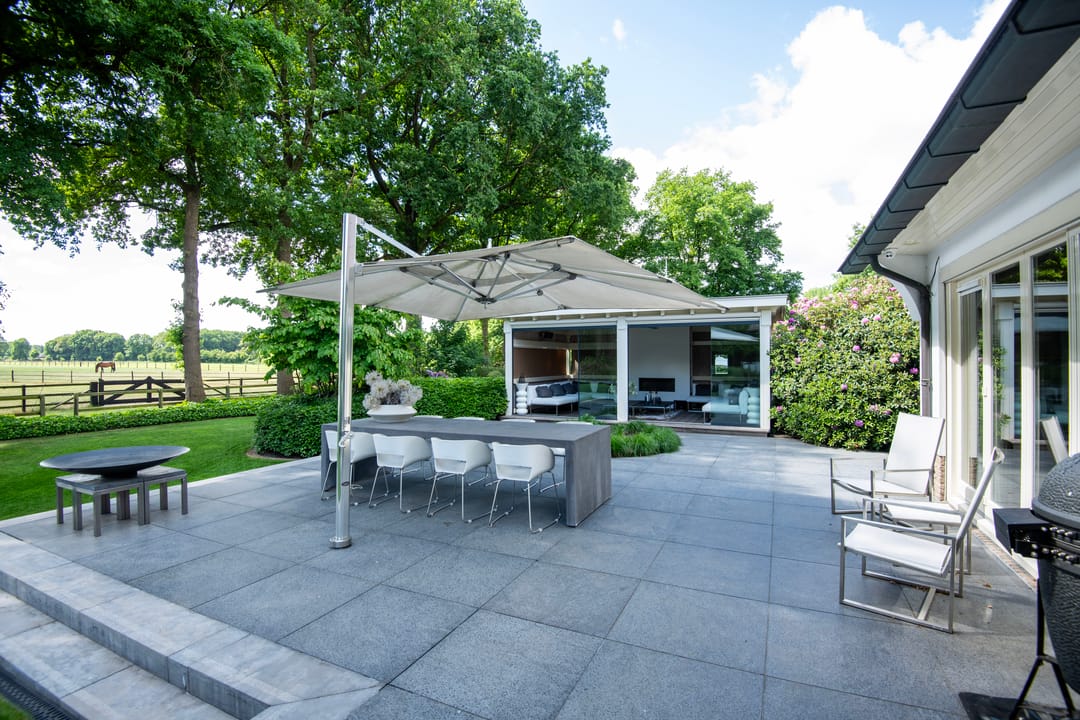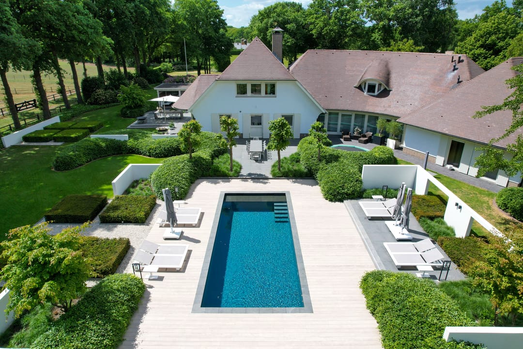 Achter de woning ligt een heerlijk zwembad, omringd door fijne zonneterrassen en een stijlvol tuinhuis, voorzien van een glazen schuifpui en gashaard. Hier is het volop genieten; niet alleen tijdens zomerse dagen, maar het gehele jaar rond!