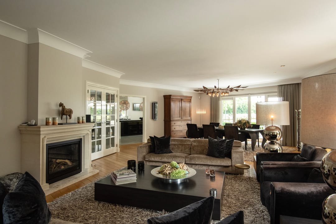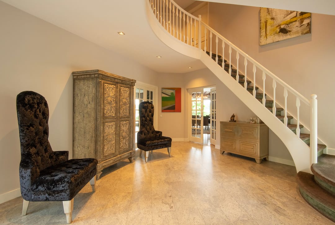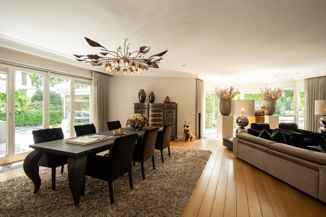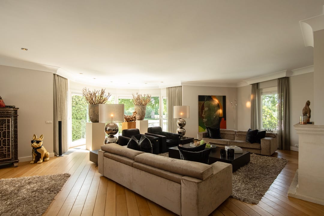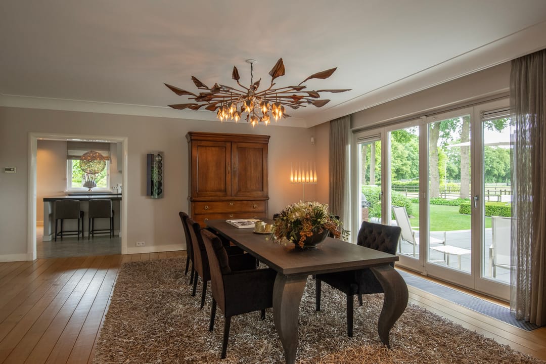 Via de luxe entreehal betreedt u de woning. De royale woonkamer heeft een sfeervolle schouw met gas- openhaard, een prachtige houten vloer en een ronde erker met veel lichtinval. Aansluitend ligt de luxe Lodder keuken met eiland, Gaggenau inbouwkoel-en vriescombinatie, 2 ovens, ijsblokjesmachine en een wijnkoelkast. Zowel de keuken als de woonkamer geven via de openslaande tuindeuren direct toegang tot de tuin, zwembad en terrassen. De praktische bijkeuken is verbonden met de keuken.
