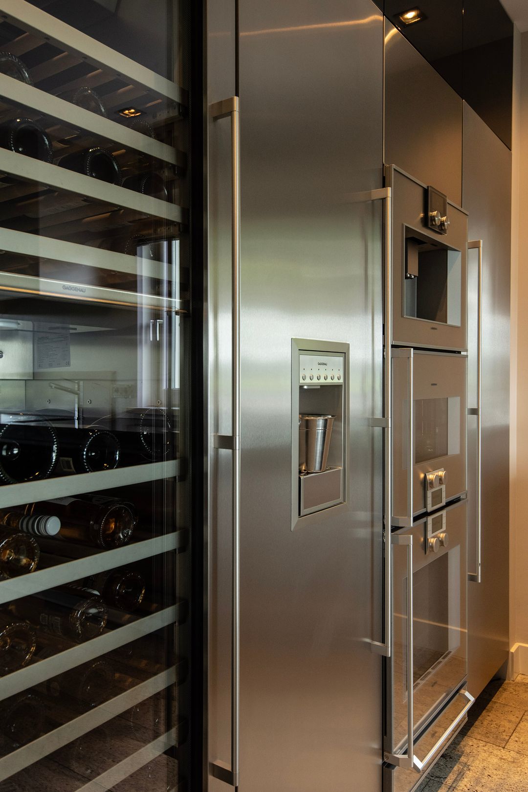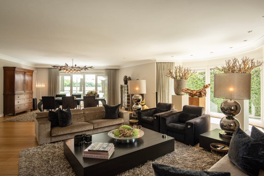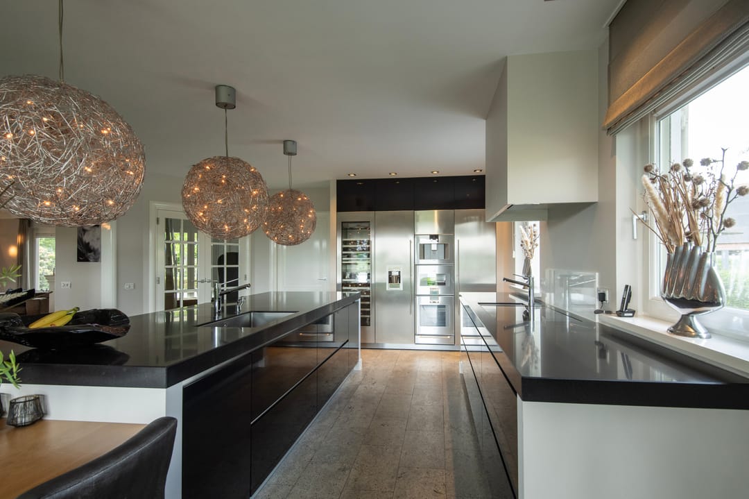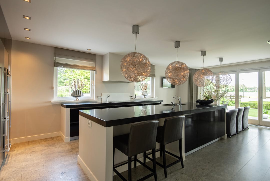 Via de luxe entreehal betreedt u de woning. De royale woonkamer heeft een sfeervolle schouw met gas- openhaard, een prachtige houten vloer en een ronde erker met veel lichtinval. Aansluitend ligt de luxe Lodder keuken met eiland, Gaggenau inbouwkoel-en vriescombinatie, 2 ovens, ijsblokjesmachine en een wijnkoelkast. Zowel de keuken als de woonkamer geven via de openslaande tuindeuren direct toegang tot de tuin, zwembad en terrassen. De praktische bijkeuken is verbonden met de keuken.