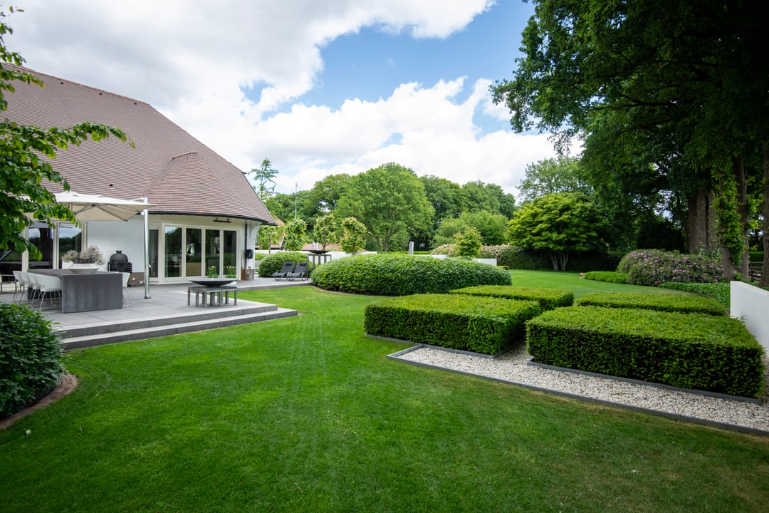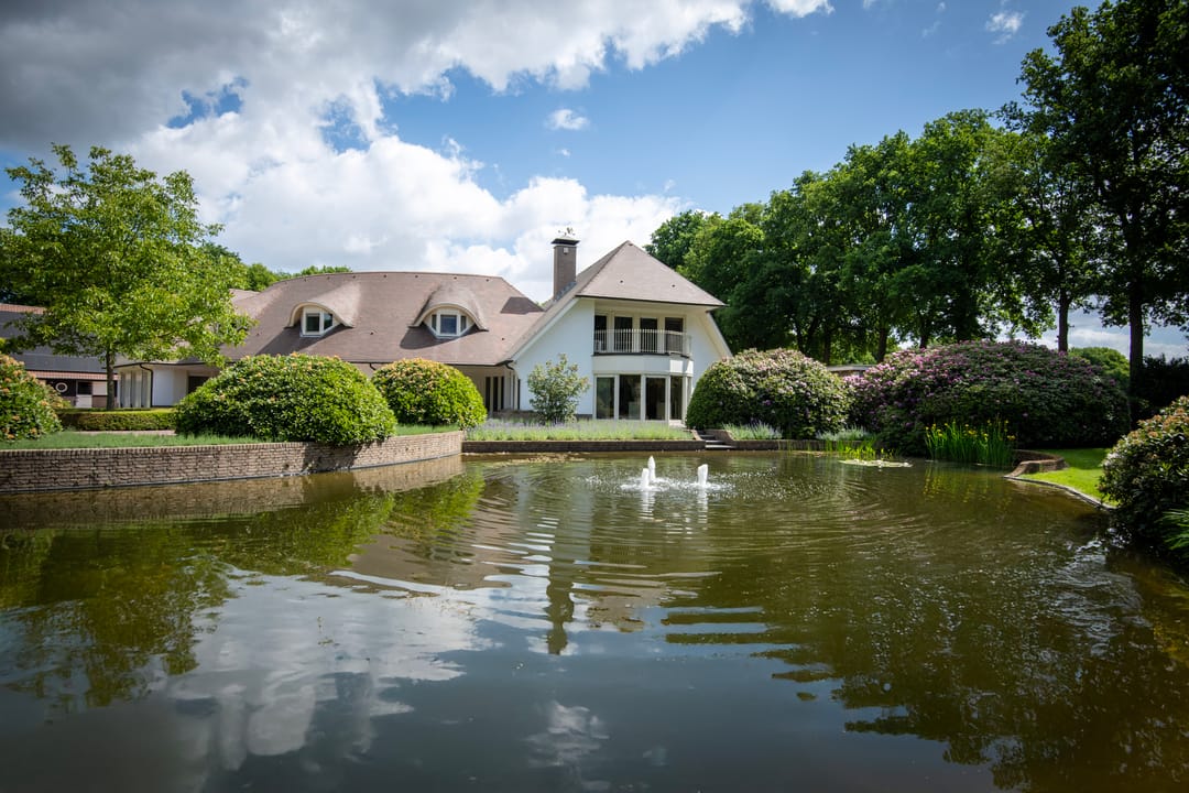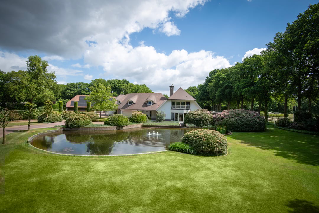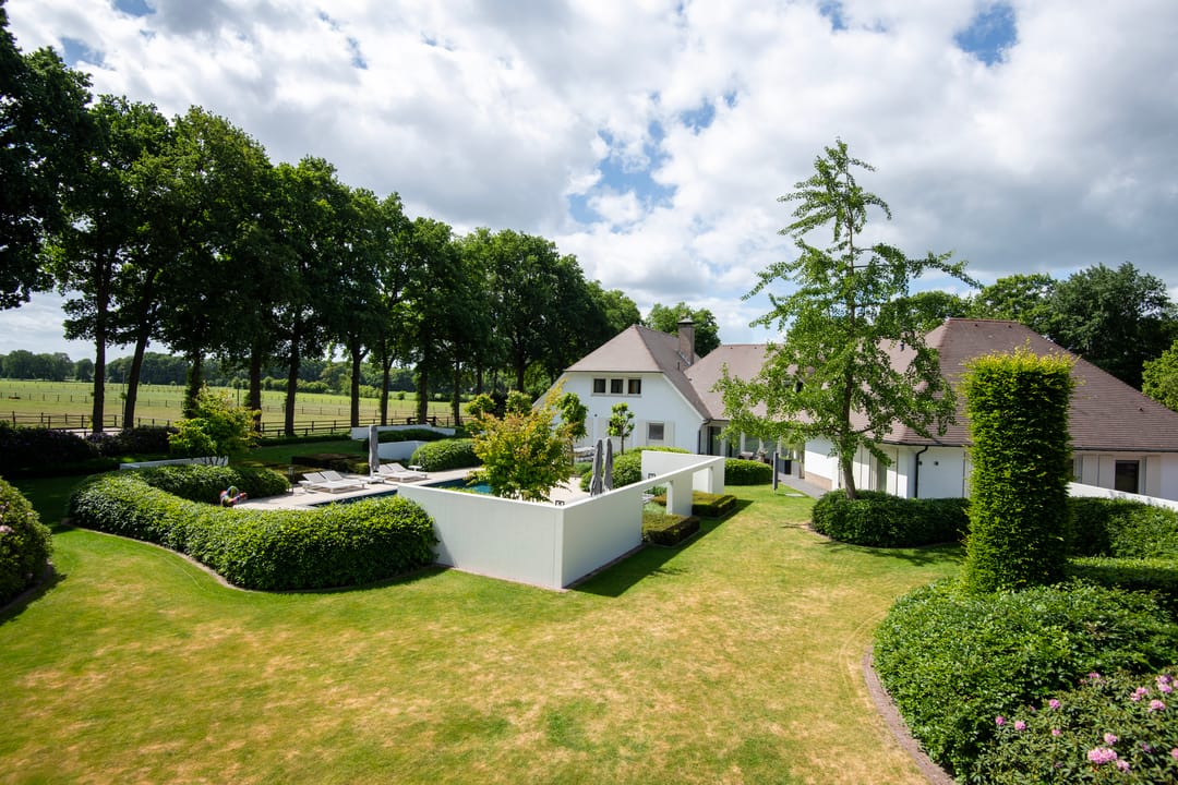De perfect onderhouden tuin biedt een prachtig zicht op een grote siervijver met fontein, omringd door gazons, bloeiende borders, rododendrons, beukenhagen en o.a. lindebomen. De speelse beukenhagen en strak gesnoeide taxus geven een moderne twist aan de achtertuin rondom het zwembad. De prachtige hoge bomen zorgen voor een fijne beslotenheid van het erf.