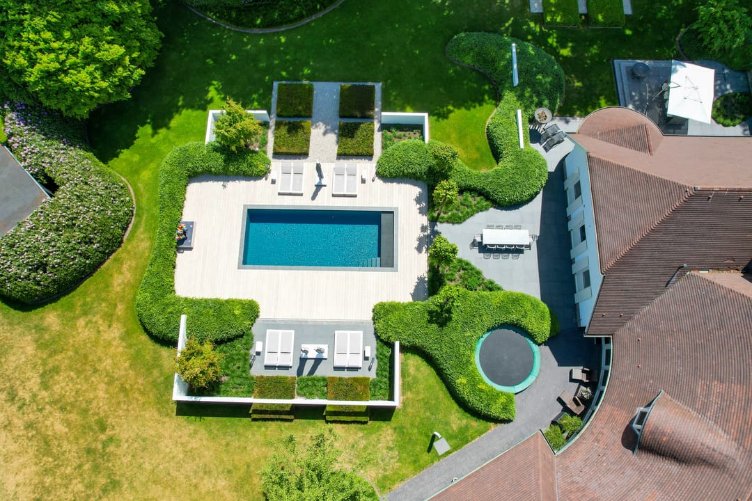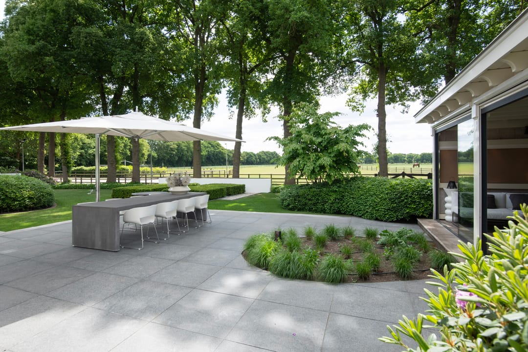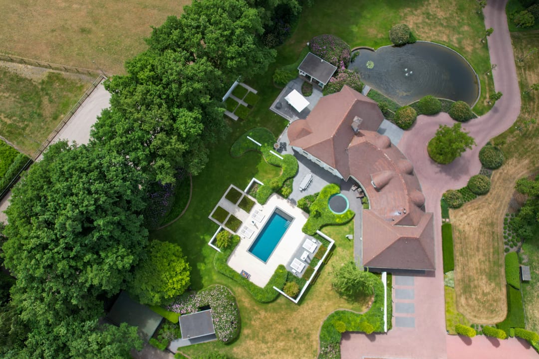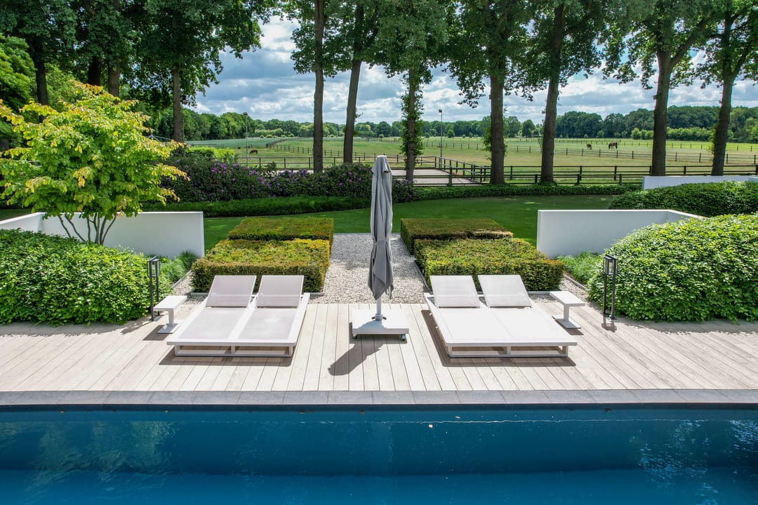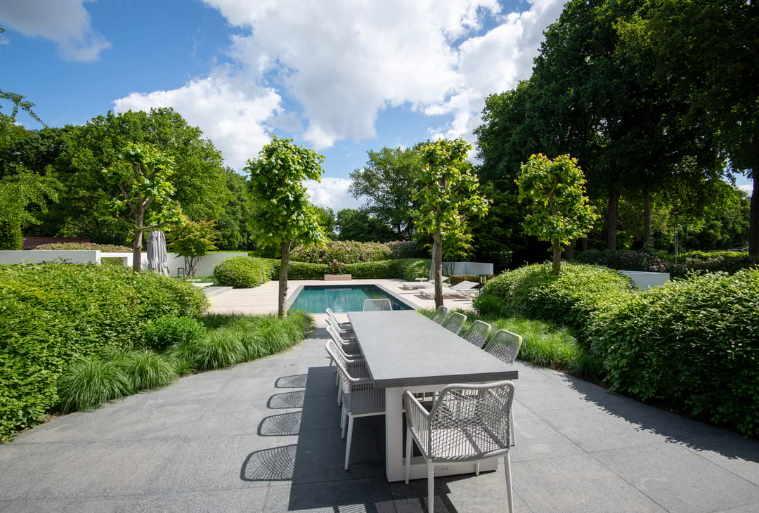 De perfect onderhouden tuin biedt een prachtig zicht op een grote siervijver met fontein, omringd door gazons, bloeiende borders, rododendrons, beukenhagen en o.a. lindebomen. De speelse beukenhagen en strak gesnoeide taxus geven een moderne twist aan de achtertuin rondom het zwembad. De prachtige hoge bomen zorgen voor een fijne beslotenheid van het erf.