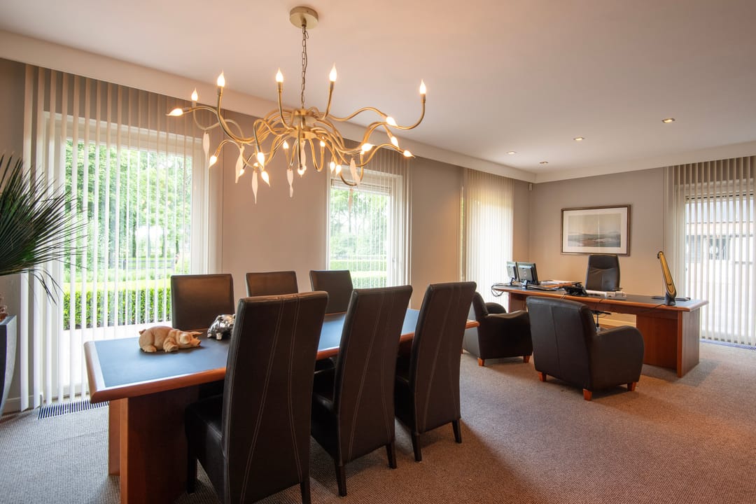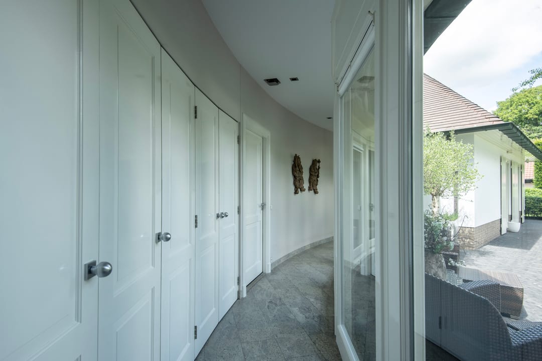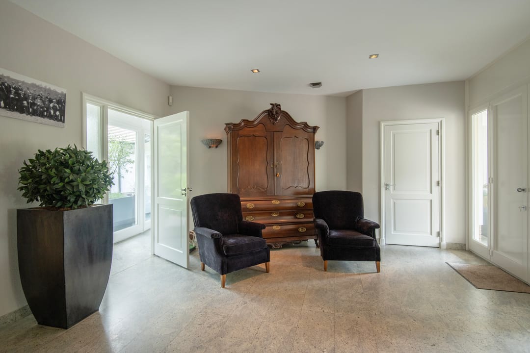 Aan de linkerzijde van de woning bevindt zich een tweede entreehal met toilet, die toegang biedt tot twee ruime kantoren, een pantry en een slaapkamer, ideaal voor werken aan huis of gelijkvloers wonen.