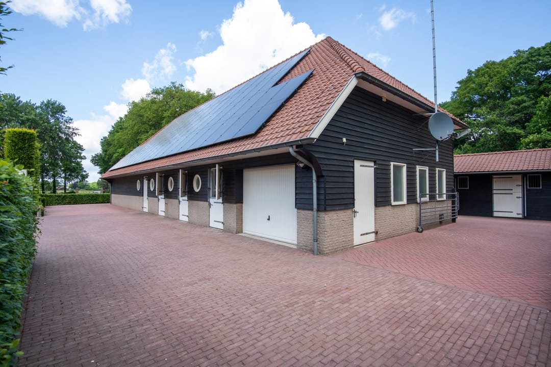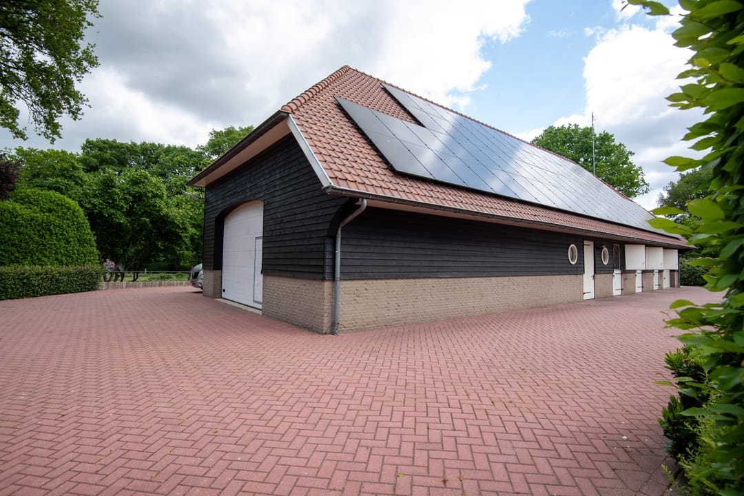 Het bijgebouw is aan de voorzijde voorzien van een grote toegangsdeur naar een royale opslagruimte. Het stalgedeelte bestaat uit 7 Brinco paardenboxen, waarvan 3 stallen een buitenluik met weefrek hebben. Er is ook een was-/poetsplaats aanwezig. Aan de achterzijde bevindt zich een werkplaats cq. hobbyruimte. Afmeting van het dit gehele bijgebouw is circa 25 x 8,5 m. = 212,5 m². Boven de stal is een hooizolder met vide. Opgetrokken in gepotdekselde rabatdelen op een gemetselde plint, het dak is gedekt met pannen en zonnepanelen.