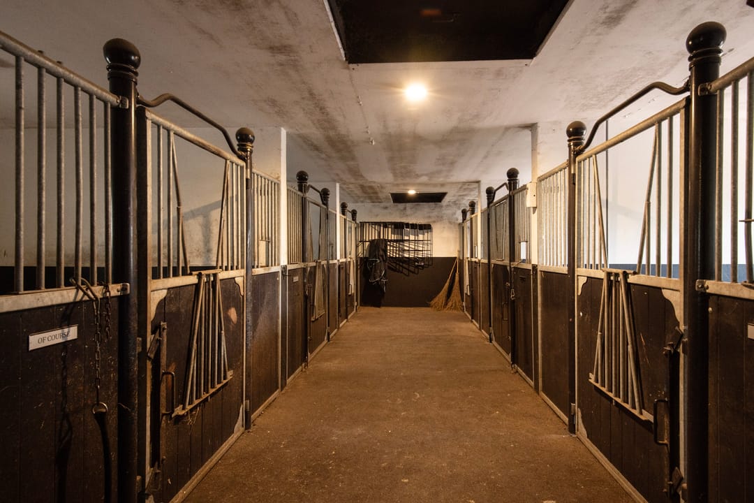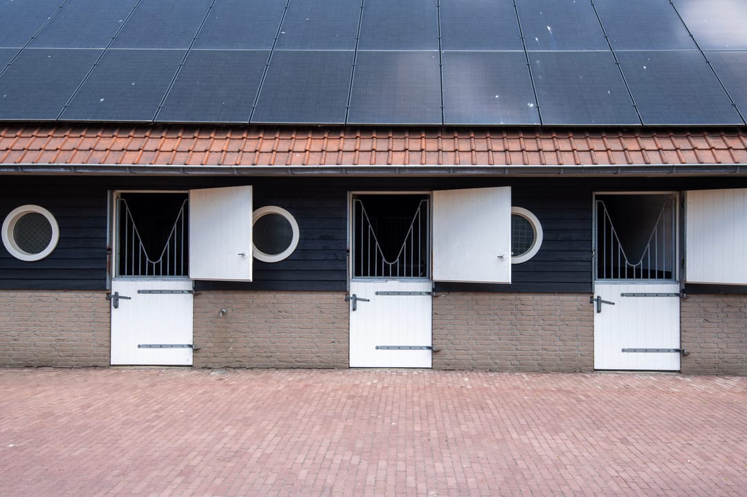 4 buitenstallen/boxen met bovenluik en overstek. Afmeting van circa 12,5 x 3,3 m. = circa 41 m². Opgetrokken in gepotdekselde houten wanden, met een pannengedekt dak.