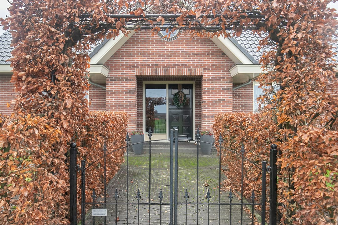 De woning heeft een aangebouwde veranda en een ruim gazon, omsloten door een beukenhaag, aan de voorzijde.