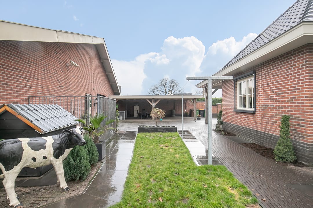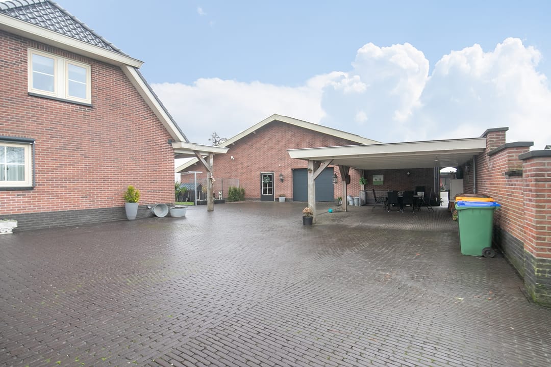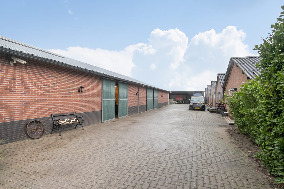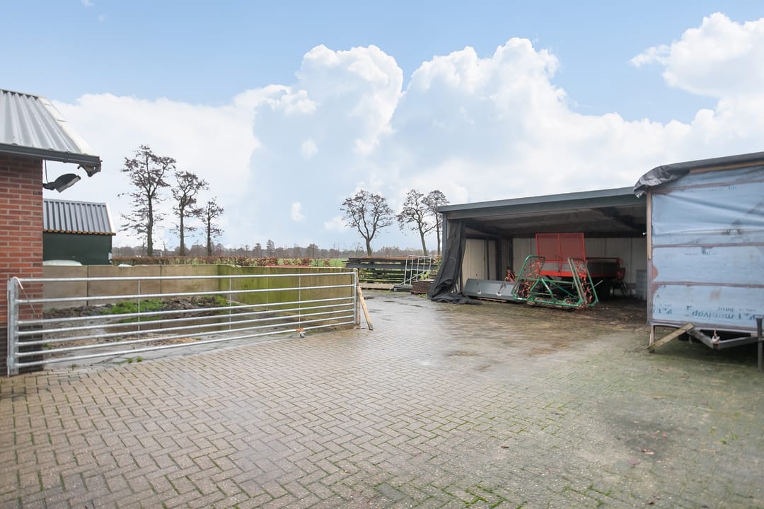 Achter deze hal ligt een vaste mestopslag van 40 m2 en er staat nog een separate overkapping. De erfverharding bestaat uit betonklinkers.
