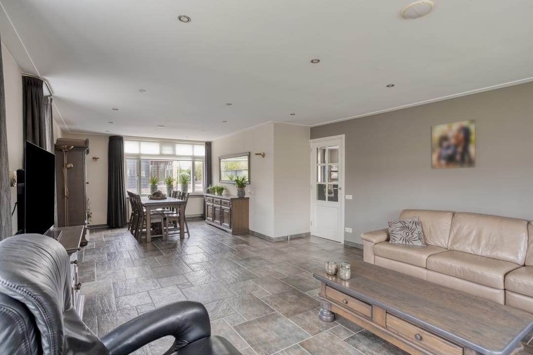 Aan de voorzijde van de woning bevindt zich de woonkamer. Het daglicht valt breed naar binnen door de vele raampartijen aan zowel de voorzijde als de zijkant van de woonkamer. Een pelletkachel zorgt voor extra warmte en sfeer tijdens de koude wintermaanden.
