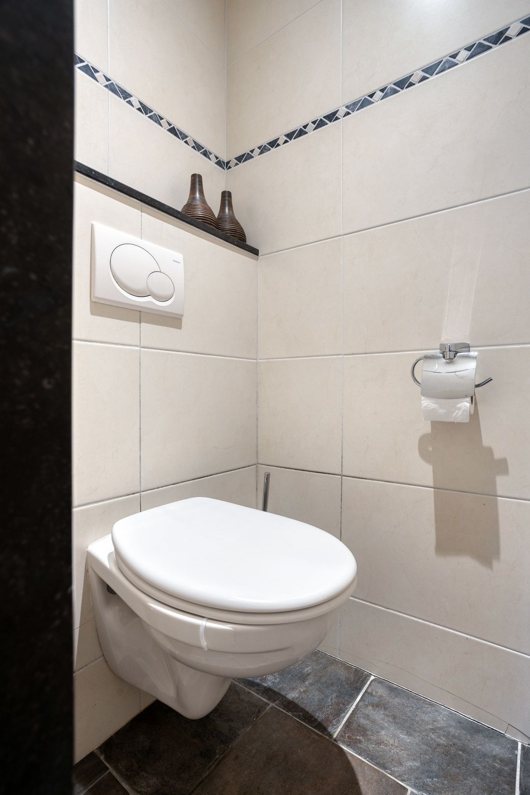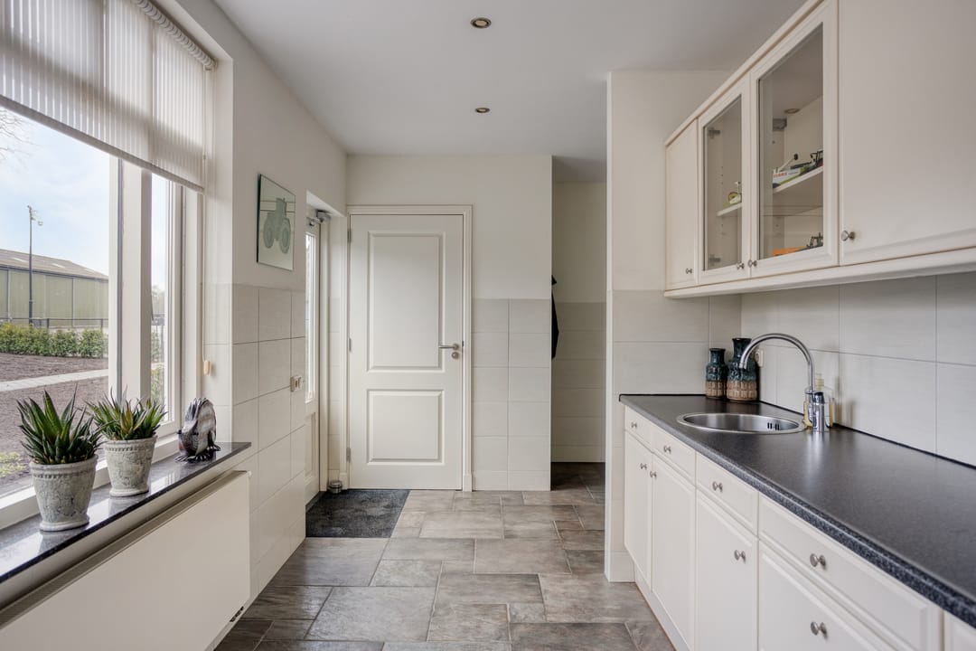 De bijkeuken is zowel vanuit buiten als vanuit de woonkeuken te bereiken. Hier heeft u de beschikking over een praktisch keukenblok, een ruime inloopkast, maar ook hier bevindt zich de garderobe en de separate toiletruimte.