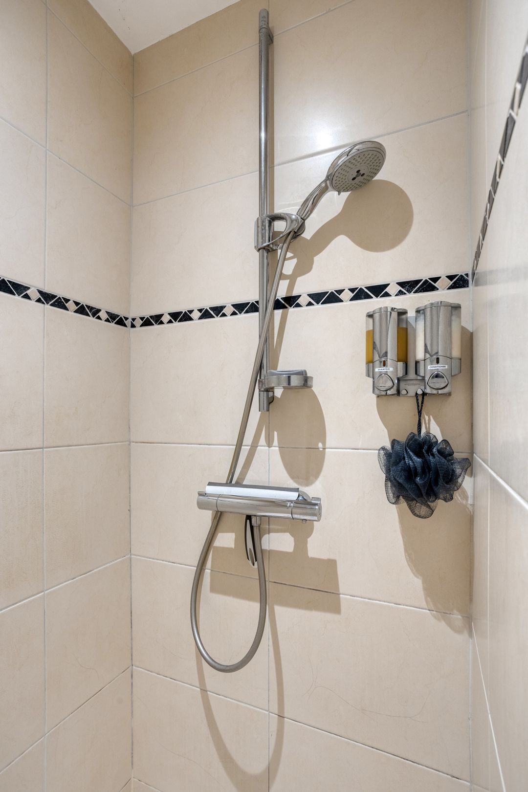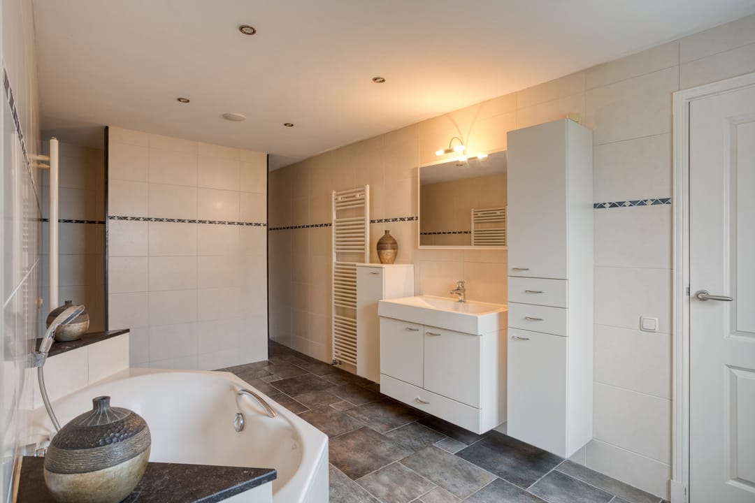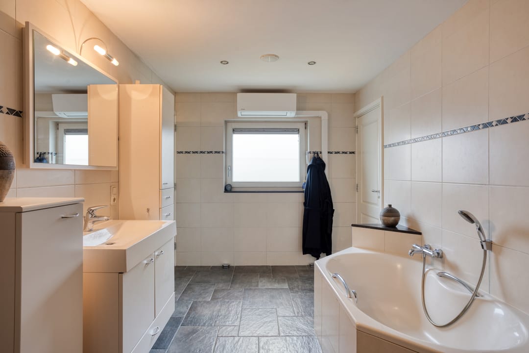 De badkamer is ingericht met een ligbad, een wastafel in een meubel, een ruime inloopdouche en een toilet. Een raam zorgt voor de natuurlijke lichtinval en natuurlijke ventilatie naast de mechanische ventilatie. Tevens is er een airco (verwarmen en koelen) aanwezig in de badkamer.