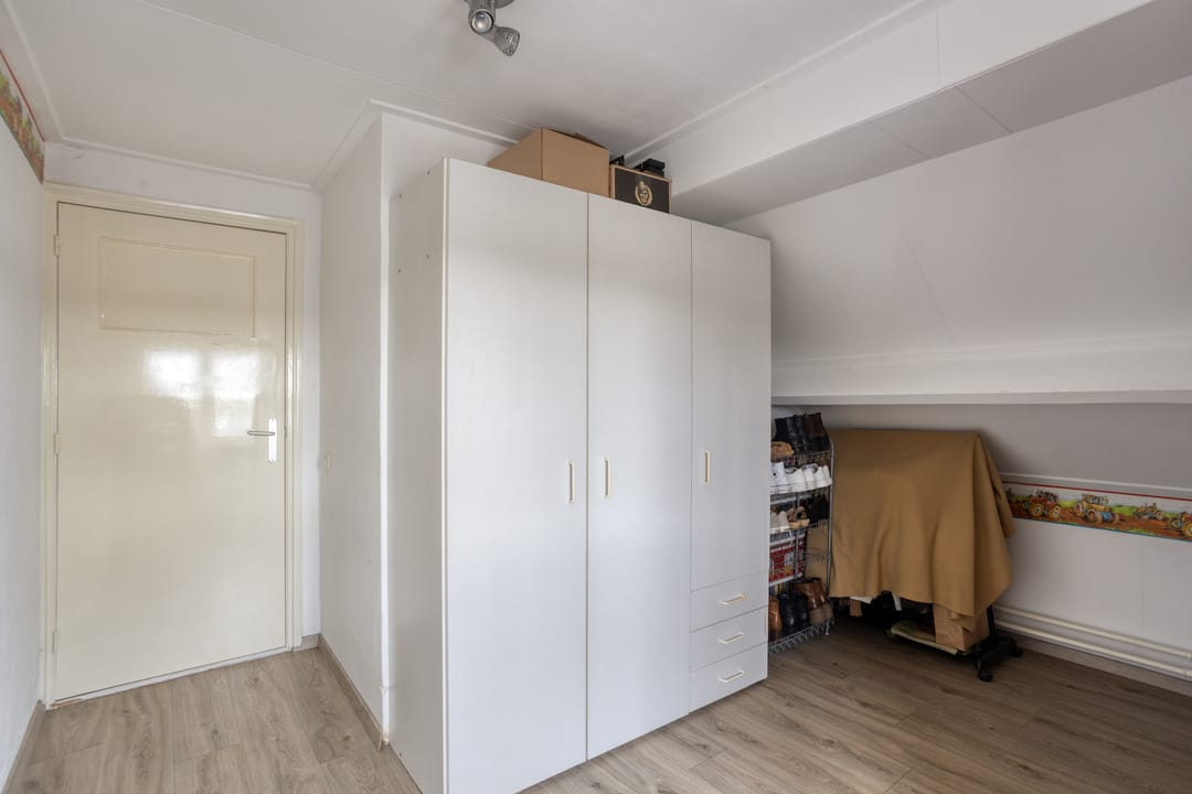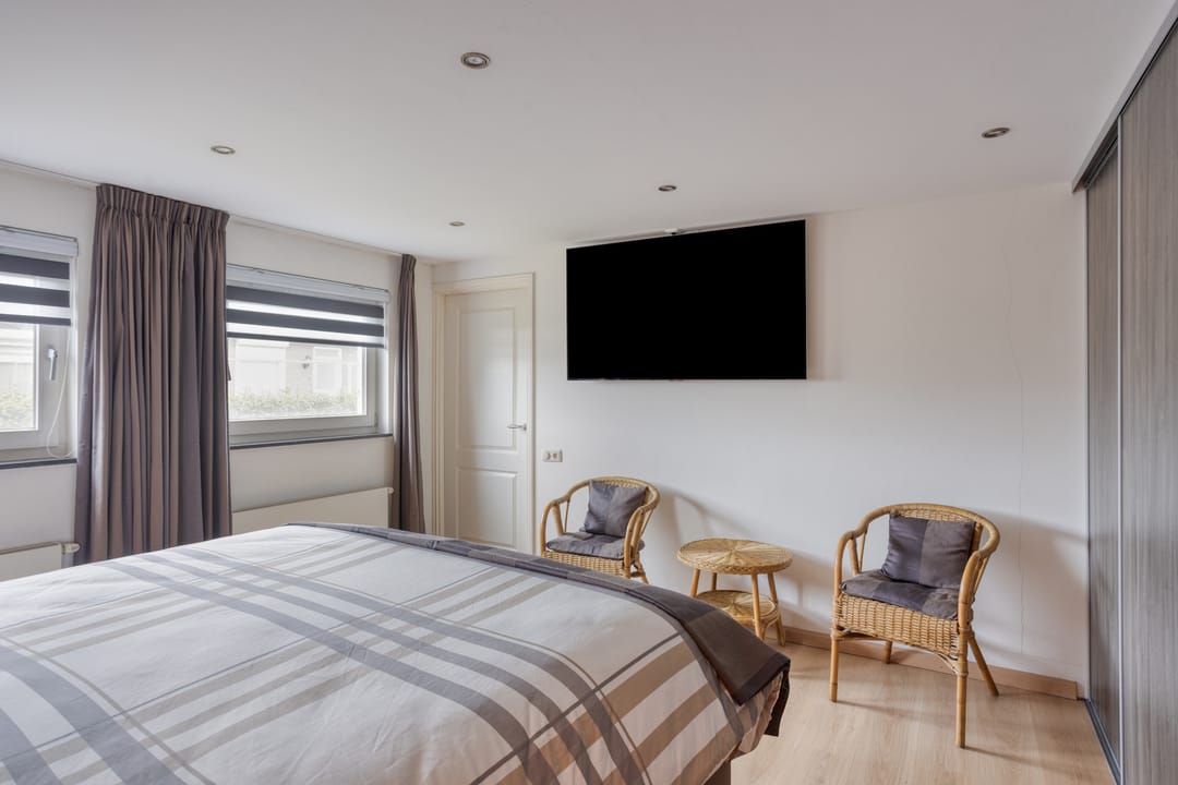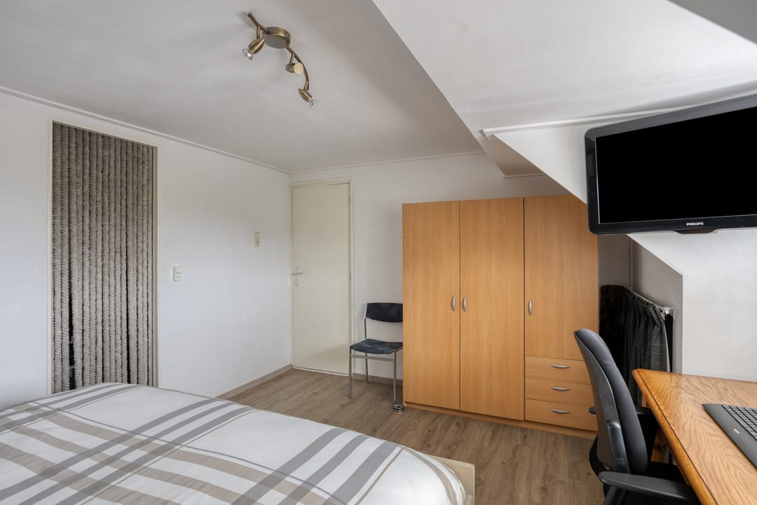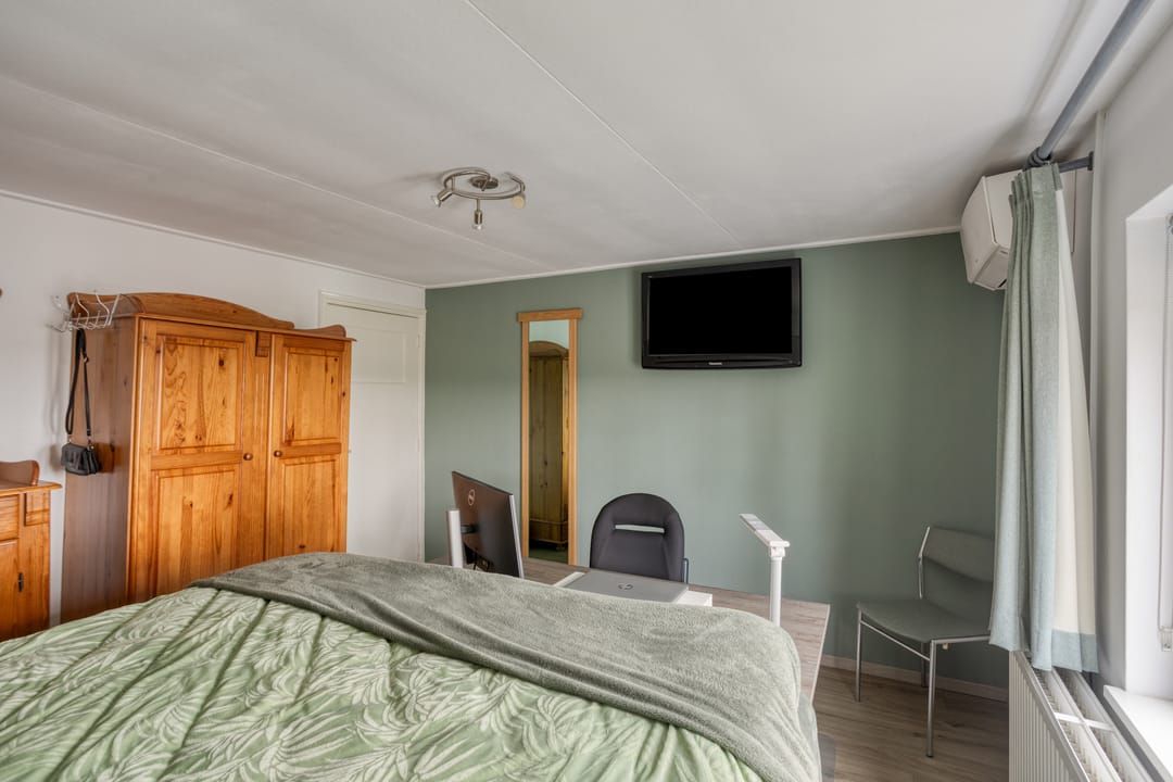 Vanuit de badkamer is de slaapkamer te bereiken welke zich aan de achterzijde van de woning bevindt. Deze slaapkamer heeft de beschikking over een airco, waardoor het tijdens de warme zomermaanden en de koude wintermaanden behaaglijk blijft en een praktische vaste kast.