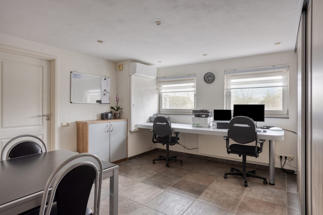 Aan de achterzijde van de woning, naast de bijkeuken bevindt zich een kantoorruimte met kastenwand, een ruim bureaublad met vaste (koffie)kast in dezelfde stijl. Ook deze ruimte heeft de beschikking over een airco (verwarmen en koelen).