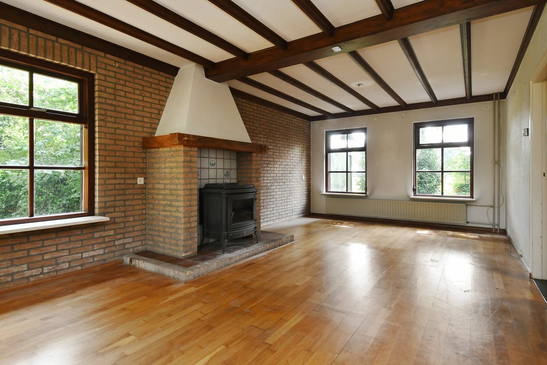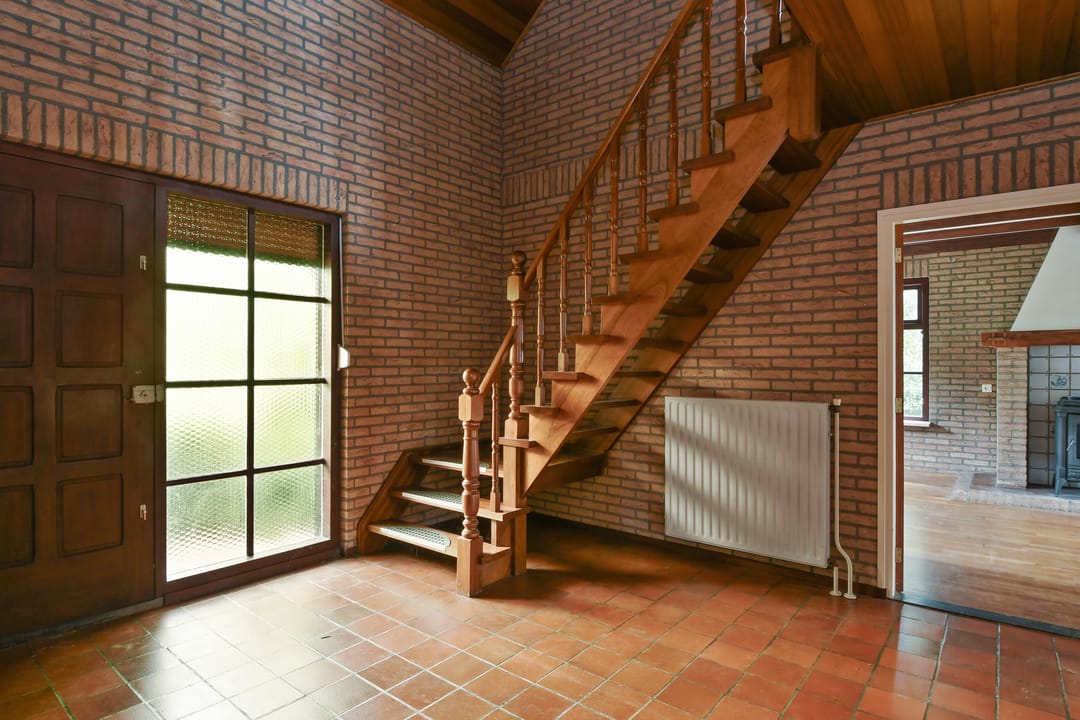 De entree/hal met trapopgang is voorzien van tegelvloer, gemetselde wanden en houten schroten plafond, geeft toegang tot de woonkamer, keuken en een tussenportaal naar de slaapkamer op de begane grond. De ruime woonkamer is voorzien van houtkachel, veel lichtinval, gemetselde wanden, balkenplafond en eiken houten vloer.