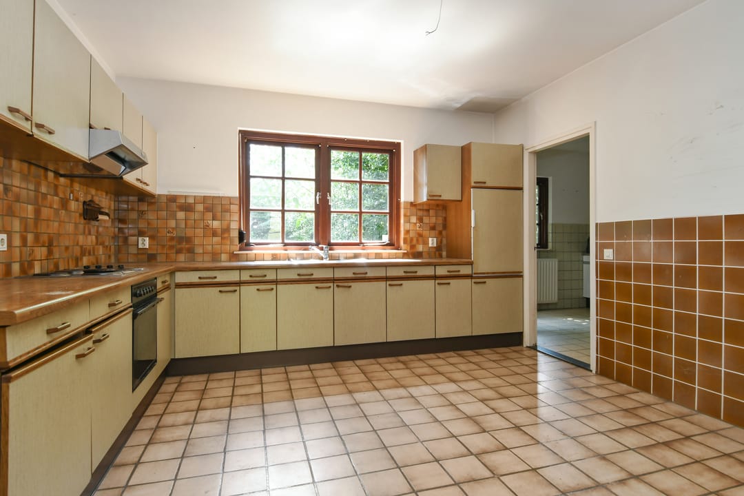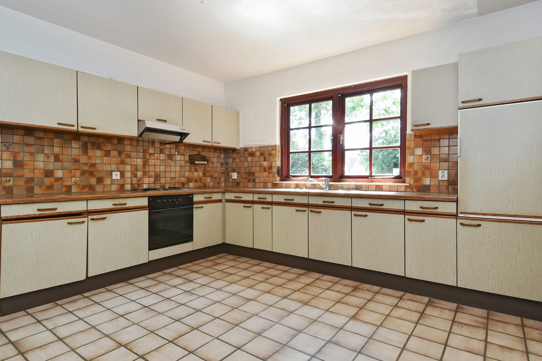 De ruime keuken is voorzien van deels betegelde en deels gestucte wanden, gestuct plafond, tegelvloer en diverse apparatuur (kookplaat, afzuigkap en koelkast).