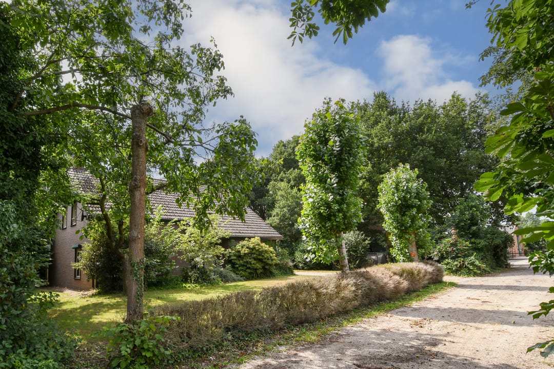 Aan de voorzijde van de woning ligt een oprit met toegang tot de bedrijfsgebouwen. Het erf is verhard met klinkers en gestort beton.