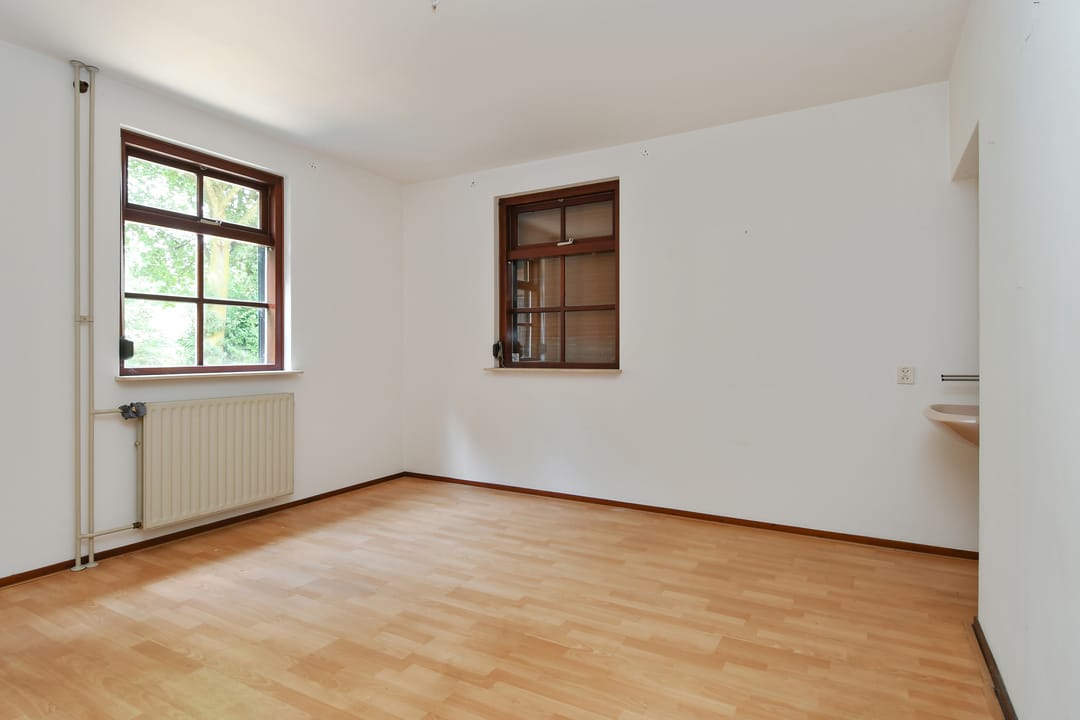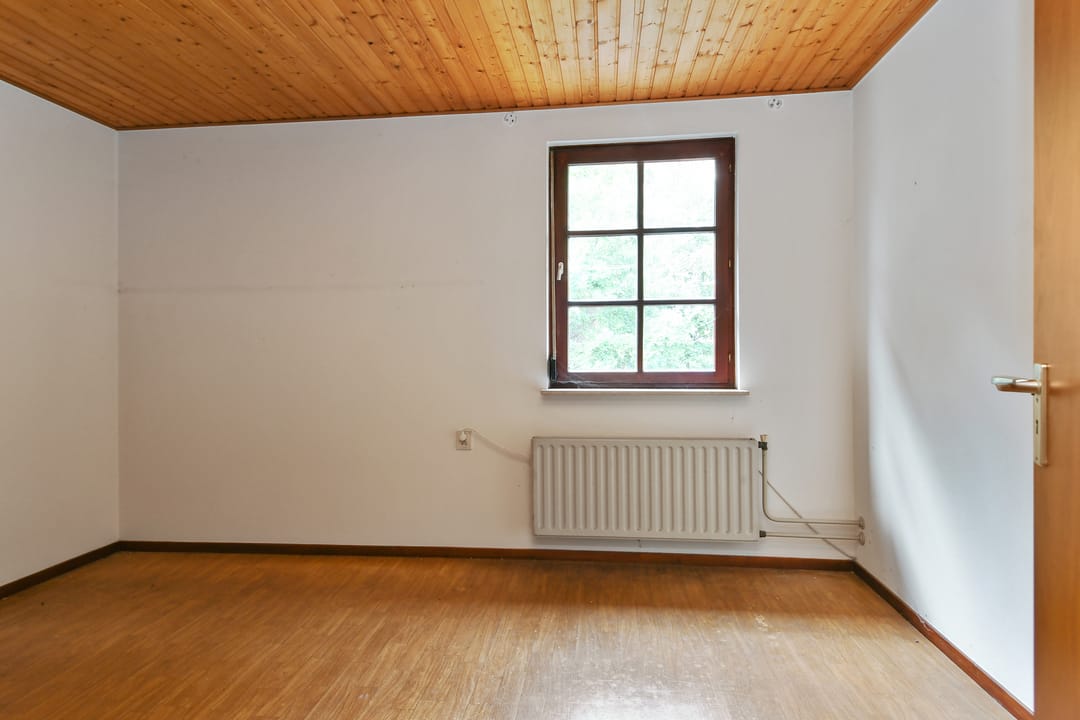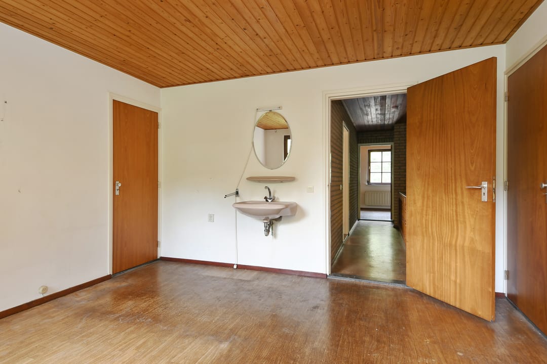 De slaapkamer op de begane grond is voorzien van gestucte wanden en plafond en novilonvloer.