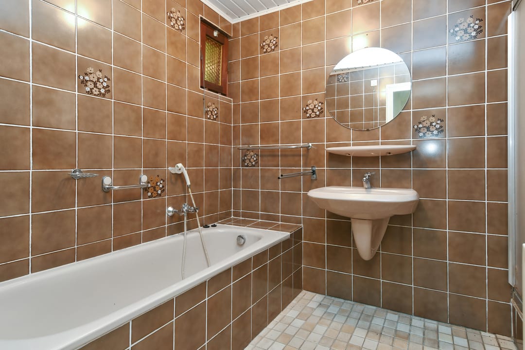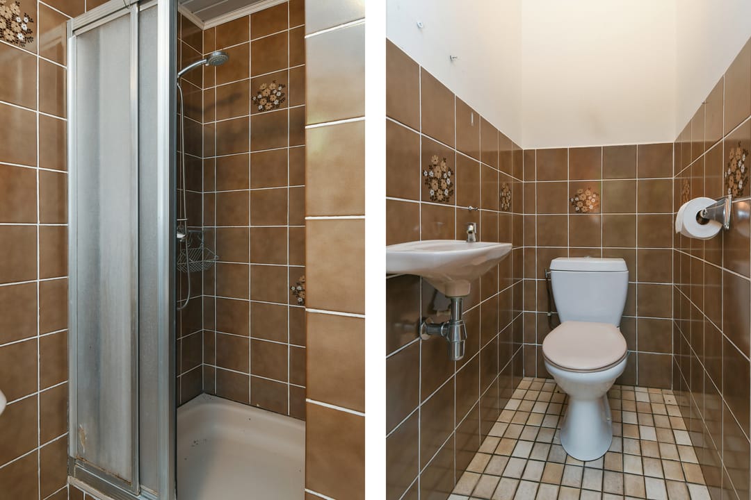 De badkamer is geheel betegeld en voorzien van ligbad, wastafel en douche. De toiletruimte is voorzien van toilet en fonteintje, de wanden zijn deels betegeld en deels gestuct, verder voorzien van gestuct plafond en tegelvloer.