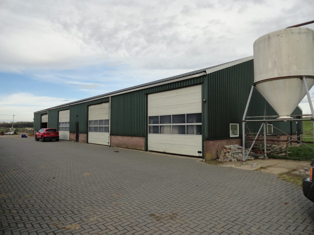 * Bedrijfsgebouw groot, voorzien van betonvloer, 4 brede overheaddeuren.