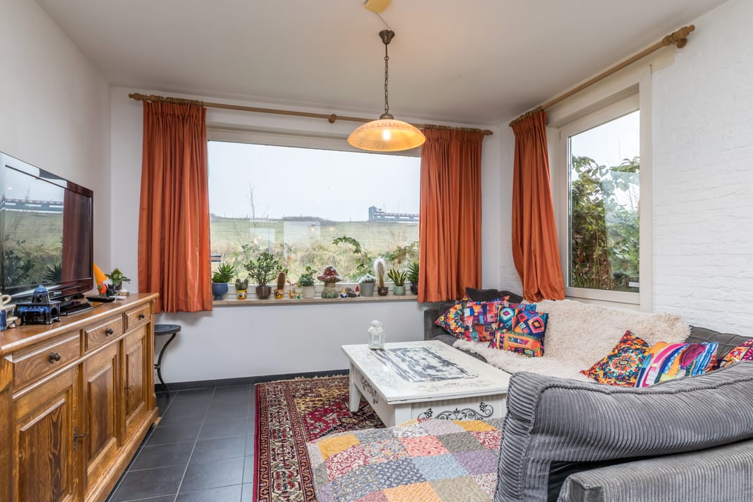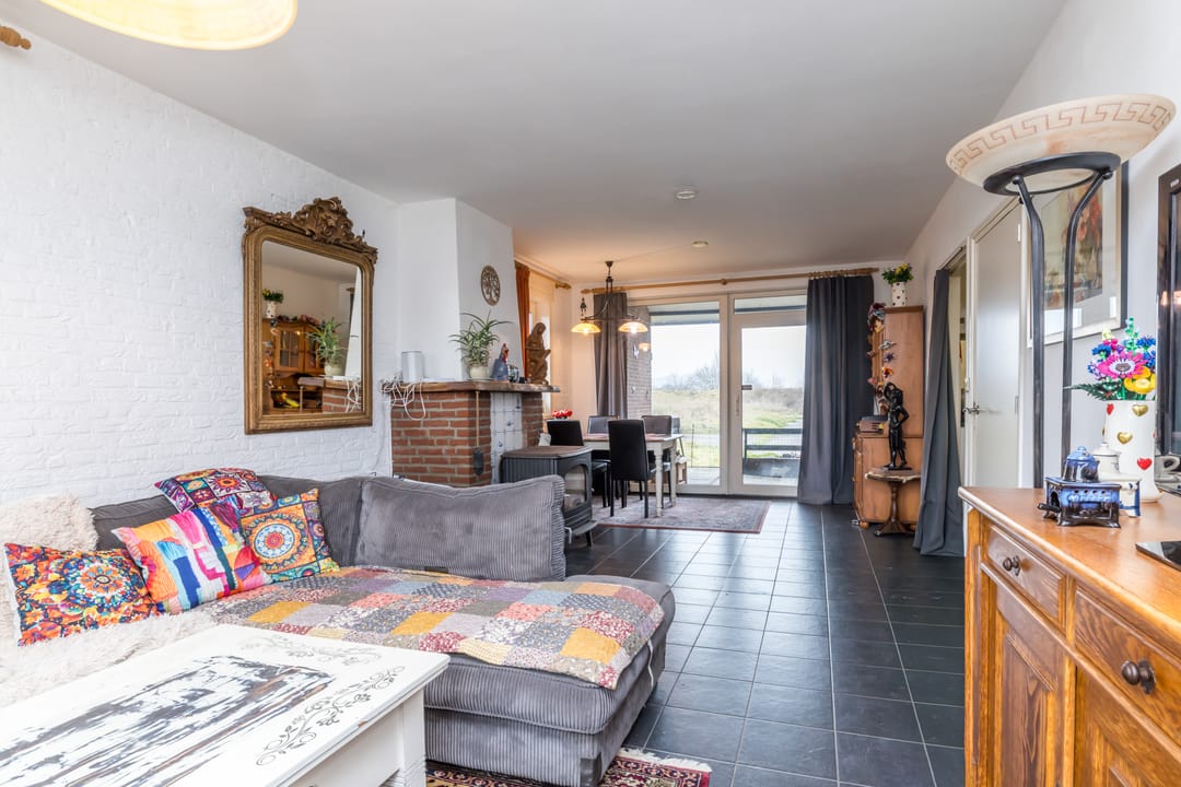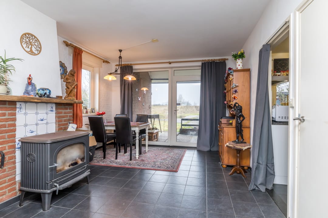 Vanuit de hal kan men de woonkamer met eetkamer bereiken. De woonkamer is voorzien van plavuizen en beschikt over een houtkachel. Vanuit de woon/eetkamer heeft u toegang tot de ruime terrasoverkapping.